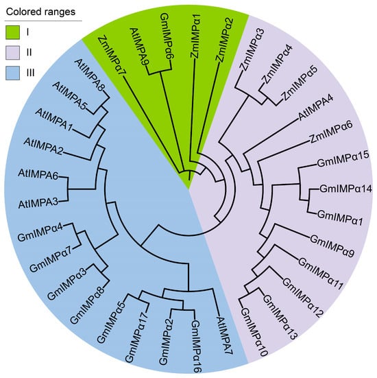 Phylogenetic relationships of IMPα proteins in soybean, Arabidopsis, and maize. Phylogenetic analysis was performed using full-length IMPα protein sequences. Species abbreviations are as follows: At, Arabidopsis thaliana; Gm, Glycine max; and Zm, Zea mays. Distinct phylogenetic groups are highlighted in different colors to illustrate evolutionary divergence among the three species.