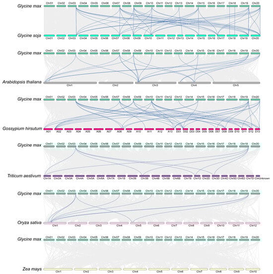 Comparative synteny analysis of IMPα genes across seven plant species. Syntenic relationships were analyzed among Glycine max (soybean), Glycine soja (wild soybean), Arabidopsis thaliana (Arabidopsis), Gossypium hirsutum (cotton), Triticum aestivum (wheat), Oryza sativa (rice), and Zea mays (maize). Gray lines represent whole-genome syntenic blocks between chromosomes; blue lines specifically highlight collinear IMPα gene pairs.