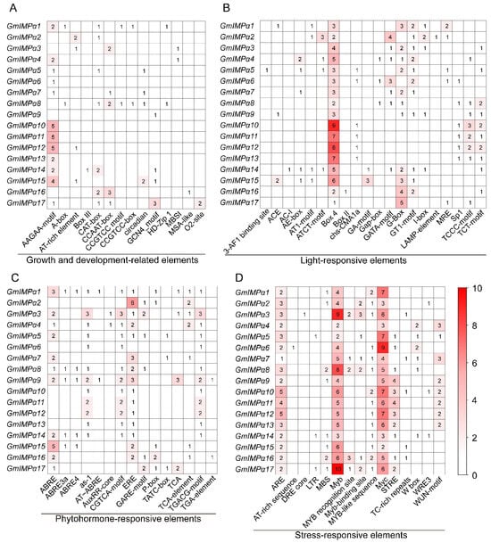 Analysis of cis-acting elements in GmIMPα gene promoters. (A) Growth and development-related elements. (B) Light-responsive elements. (C) Phytohormone-responsive elements. (D) Stress-responsive elements. The bottom section displays the types of cis-acting elements. The numbers within the boxes represent the count of each type of element, and the color key on the right illustrates the correspondence between the number of elements and the color of the corresponding box.