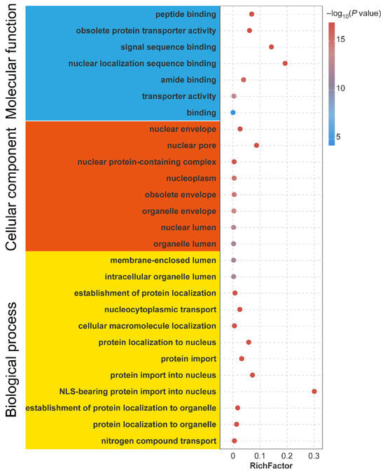 Gene Ontology (GO) enrichment analysis of the GmIMPα gene family. The vertical axis represents functional categories of the GO, while the horizontal axis displays the rich factor. The dots indicate −log10 (p value). Entries with blue backgrounds denote molecular function terms, orange-red backgrounds represent cellular component terms, and yellow backgrounds correspond to biological processes.