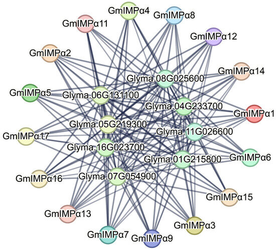 Protein–protein interaction network analysis of GmIMPα proteins. The network was constructed using the STRING database. Proteins are represented as nodes, and interactions as edges. Gray edges denote direct interactions with GmIMPα proteins. Edge thickness reflects interaction confidence scores (>0.4), with thicker lines representing stronger experimental or functional evidence.