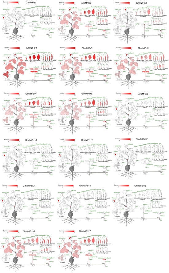 To investigate the biological functions of GmIMPα genes, we analyzed their transcript levels across 28 soybean tissues using RNA-seq data available in the SoyOmics platform (Figure 9). All 17 GmIMPα genes exhibited detectable expression in at least one tissue, and distinct expression patterns were observed. For instance, GmIMPα5, GmIMPα7, and GmIMPα17 were highly expressed in cotyledons; GmIMPα2, GmIMPα4, GmIMPα5, GmIMPα7, GmIMPα8, GmIMPα16, and GmIMPα17 showed high transcript levels in the hypocotyl. Specific subsets of genes exhibited strong expression in other tissues, including nine genes in the shoot apex, four in the simple leaf, four in the trifoliate leaf, seven in the flower, six in the pod, seven in the seed, eight in the axillary bud, and seven in the root. Remarkably, GmIMPα1, GmIMPα9, GmIMPα10, GmIMPα11, GmIMPα12, GmIMPα13, GmIMPα14, and GmIMPα15 displayed flower-specific expression, with nearly undetectable transcript levels in other tissues, strongly suggesting their potential involvement in flower development. GmIMPα genes exhibit tissue-specific expression and likely play roles in various developmental processes at different stages of soybean growth.