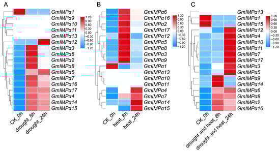 Heatmap of GmIMPα gene expression in leaves at 0 h, 8 h, and 24 h under various stress conditions. (A) Expression profile under drought stress in leaves. (B) Expression profile under heat stress in leaves. (C) Expression profile under combined drought and heat stress in leaves.