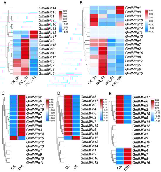 Responses to low temperature, salt, and hormone treatments further highlighted functional diversification within the GmIMPα family (Figure 11). After 1 h of cold treatment in leaves, GmIMPα2, GmIMPα4, GmIMPα6, GmIMPα8, and GmIMPα16 were rapidly induced, indicating their involvement in early cold response (Figure 11A). Conversely, GmIMPα5 and GmIMPα7 were continuously repressed, whereas GmIMPα12 and GmIMPα17 exhibited persistent induction. Under salt stress in roots (Figure 11B), GmIMPα2, GmIMPα4, GmIMPα5, GmIMPα6, GmIMPα7, GmIMPα8, GmIMPα16, and GmIMPα17 were transiently upregulated within 1 h but subsequently declined, while GmIMPα3 showed consistent downregulation. Notably, GmIMPα13 and GmIMPα14 remained weakly expressed under both cold and salt conditions in roots, suggesting limited involvement in these pathways. Hormone treatments produced distinct expression responses. Under IAA treatment in roots (Figure 11C), nine genes (GmIMPα2–8, GmIMPα16, and GmIMPα17) were upregulated. In contrast, JA treatment generally suppressed expression in roots (Figure 11D), although GmIMPα4, GmIMPα7, GmIMPα8, and GmIMPα16 were induced, highlighting a gene-specific divergence in JA responsiveness. ETH treatment in roots enhanced the expression of GmIMPα2, GmIMPα3, GmIMPα5, GmIMPα6, and GmIMPα17, but repressed GmIMPα4, GmIMPα7, GmIMPα8, and GmIMPα16 (Figure 11E).