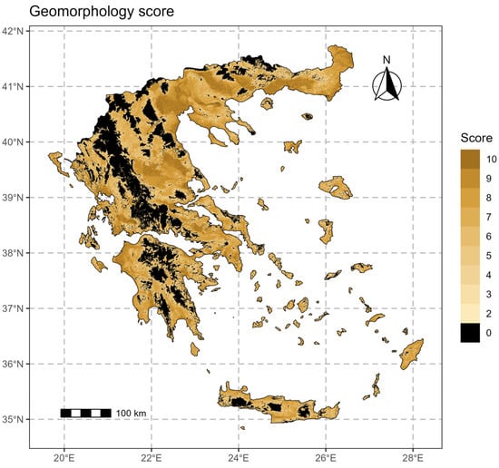 - The geomorphological parameters, after classification into suitability scores (Figures S2–S5), have been summed to create a final geomorphological score raster. This raster has been linearly normalized to obtain a score from 1 to 10 for suitable sites. If one parameter receives a score of zero (0), this value remains in the final geomorphological map.