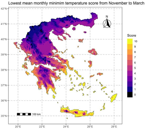 Low temperature score map (lowest mean monthly minimum temperature from November to March).