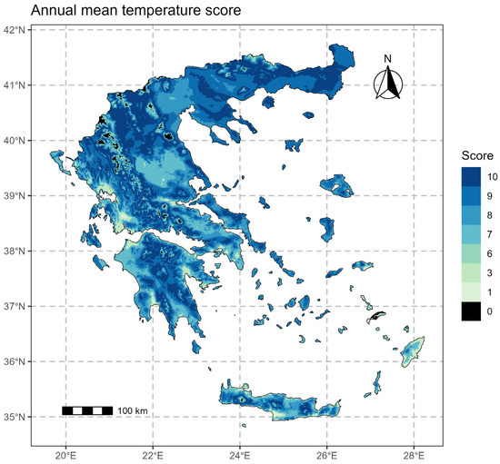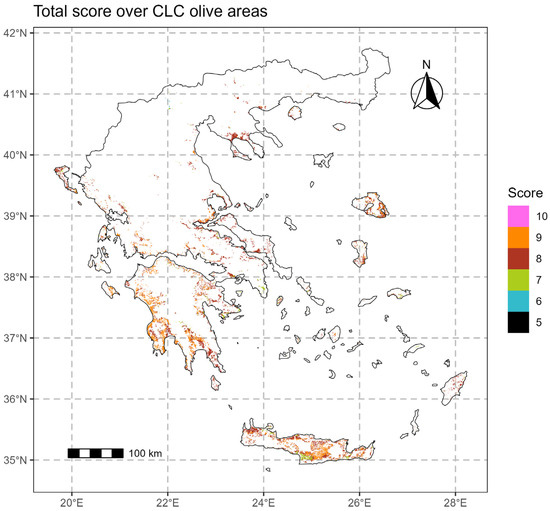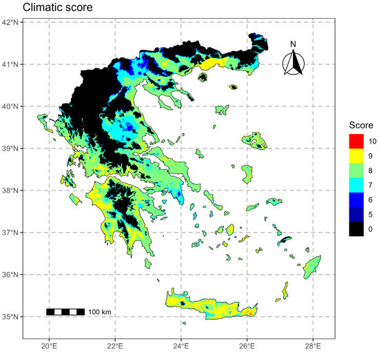 - The climatic parameter rasters have been classified according to the related score tables (Tables S5–S11) and mapped. After this step, the climatic score rasters have been summed up to a final climatic score raster. This raster has been linearly normalized to range from 1 for the less suitable areas to 10 for the optimal areas in terms of climatic conditions, and has been mapped accordingly. In cases where a climatic parameter does not allow olive cultivation, the final raster has been set to zero.