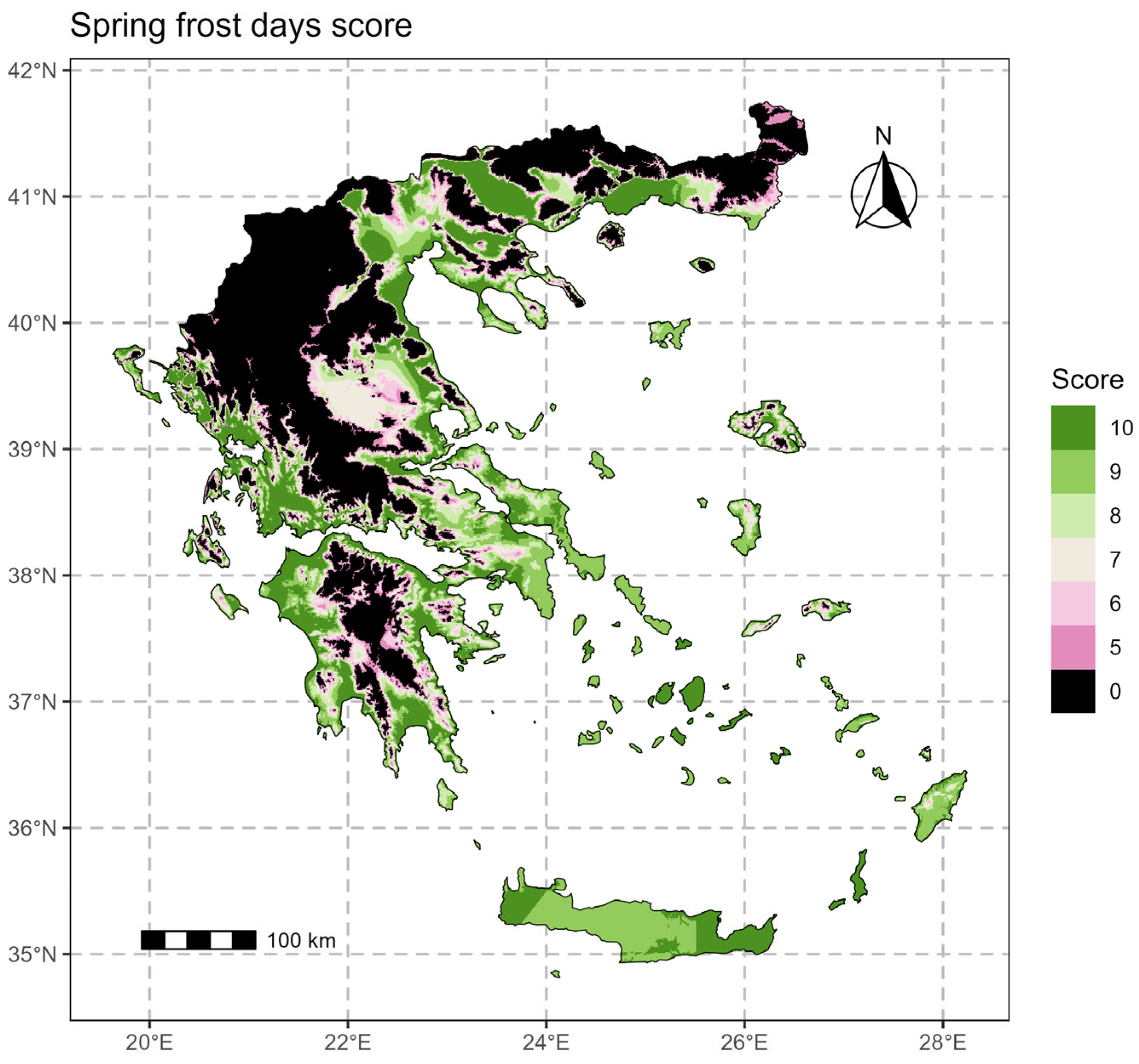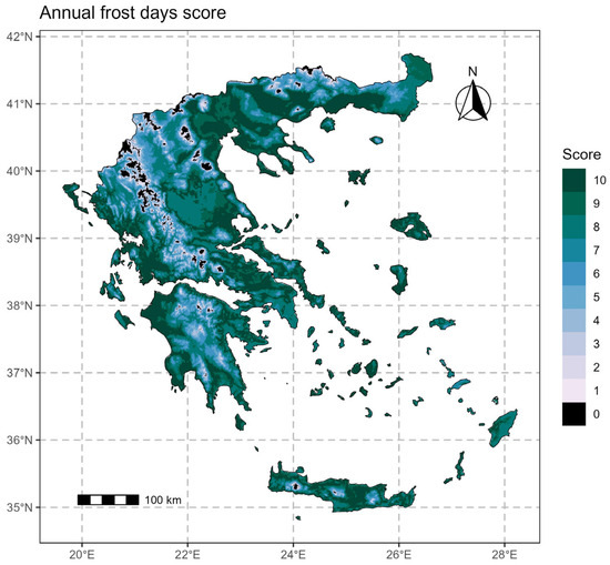 As exhibited in Figure 9, spring frost exceeding 5 days in duration (0 score; Table S11) is unsuitable over a considerably extensive area. Scattered parts of the northern, central, eastern, and western mainland, around the Peloponnese, and most of the islands are excluded, given their more optimal environment for olive cultivation, with scores of 8 to 10 (2 to 0 days; Table S11).