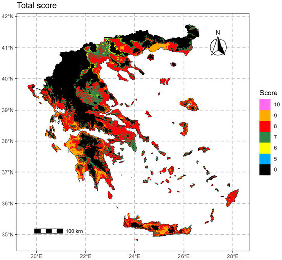 The final suitability map for olive cultivation in Greece combines the overall geomorphological and climatic score maps (Figure 2 and Figure 10, respectively) and is demonstrated in Figure 11. Each point’s final score was calculated by adding its geomorphological and climatic map scores, unless any were deemed unsuitable on either map. The resulting suitability map uses a color scale to show overall scores from 1 (lowest) to 10 (highest); zero indicates no suitability.