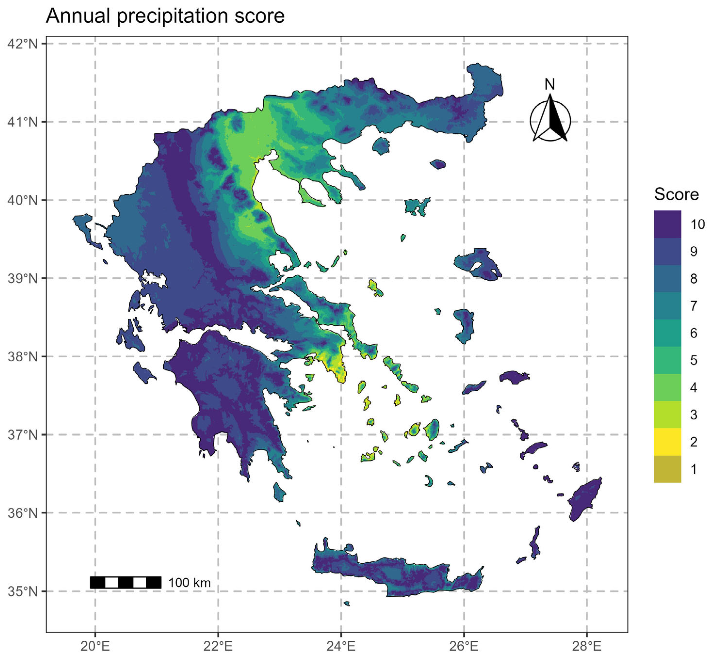 The annual precipitation score map is illustrated in Figure 4. According to the scoring map (Table S6), it appears that optimal precipitation conditions are formed over almost the entire Greek peninsula, with high scores between 7 and 10 (precipitation amount of 500–800 mm; Table S6). Less suitable areas are primarily in the north and east of the country, including some Aegean islands. This is due to the olive tree’s low water requirements.