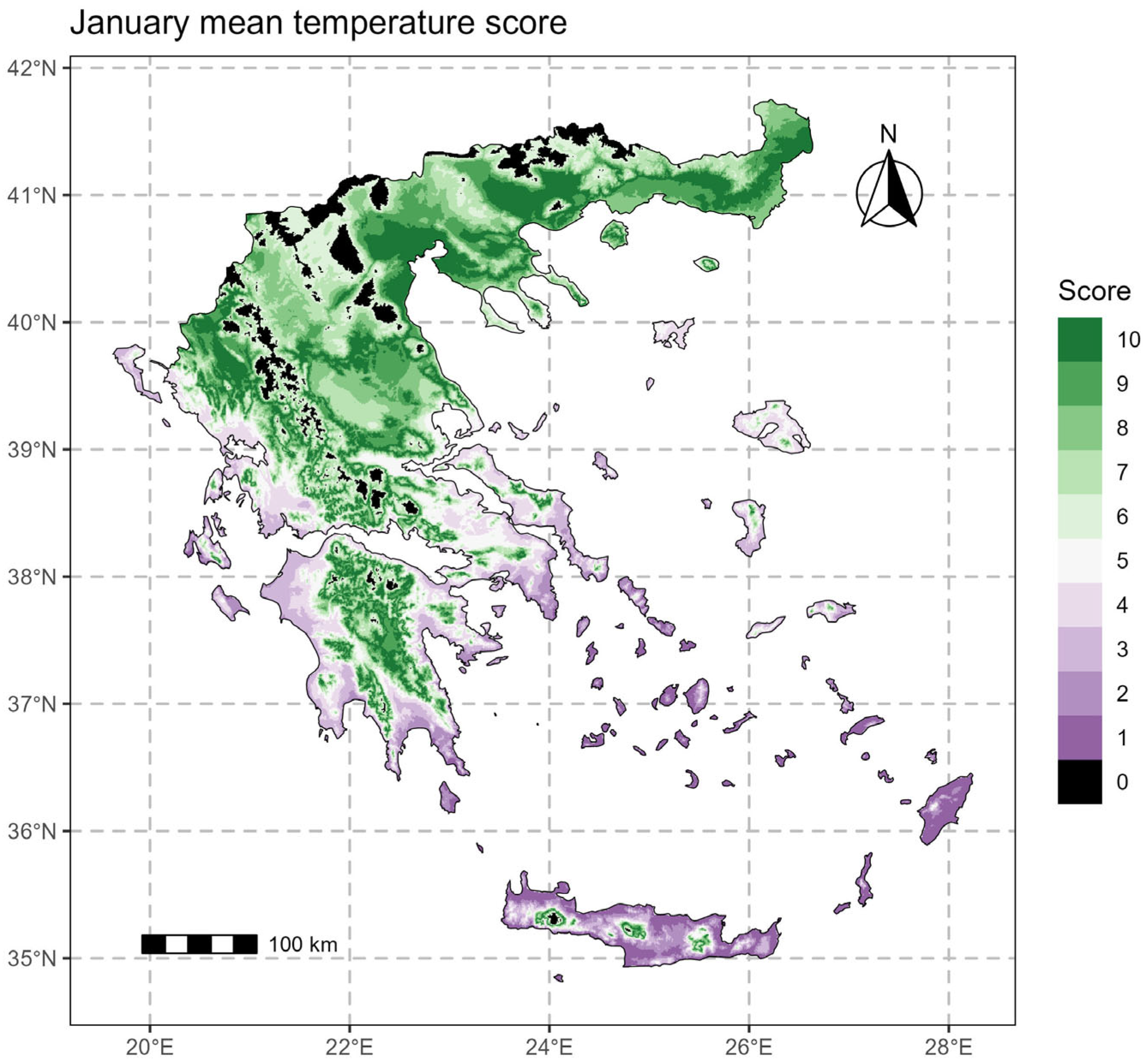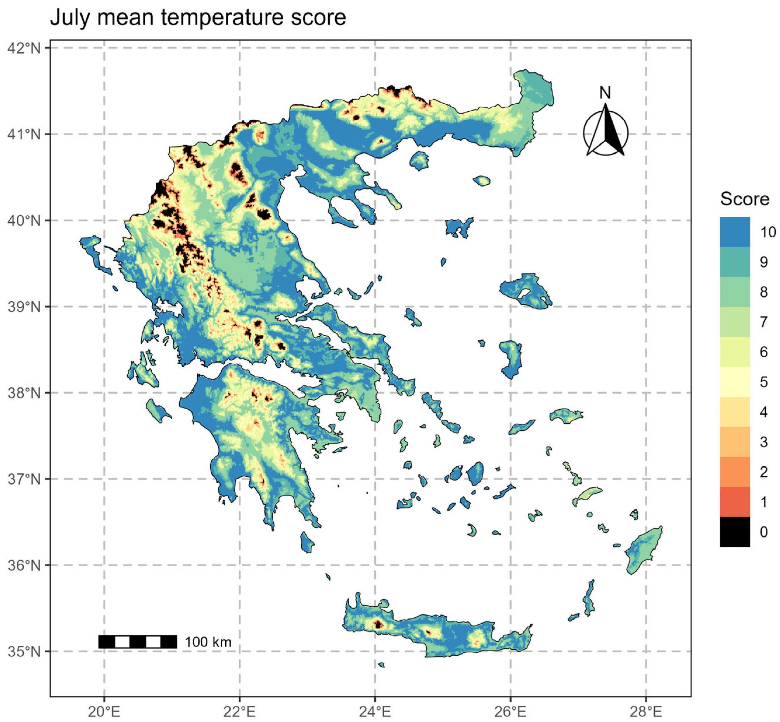 The domination of the optimal July mean temperature conditions is illustrated in Figure 6, given the extensive occurrence of scores 5 to 10 (respectively, 19–30 °C; Table S8). Relatively unsuitable temperature regimes (scores of above 32 or below 16.5 °C), along with the prohibitive 0 score, result in majorly over-dispersed mountainous terrains (north, central continental Greece, Peloponnisos, and Crete).
