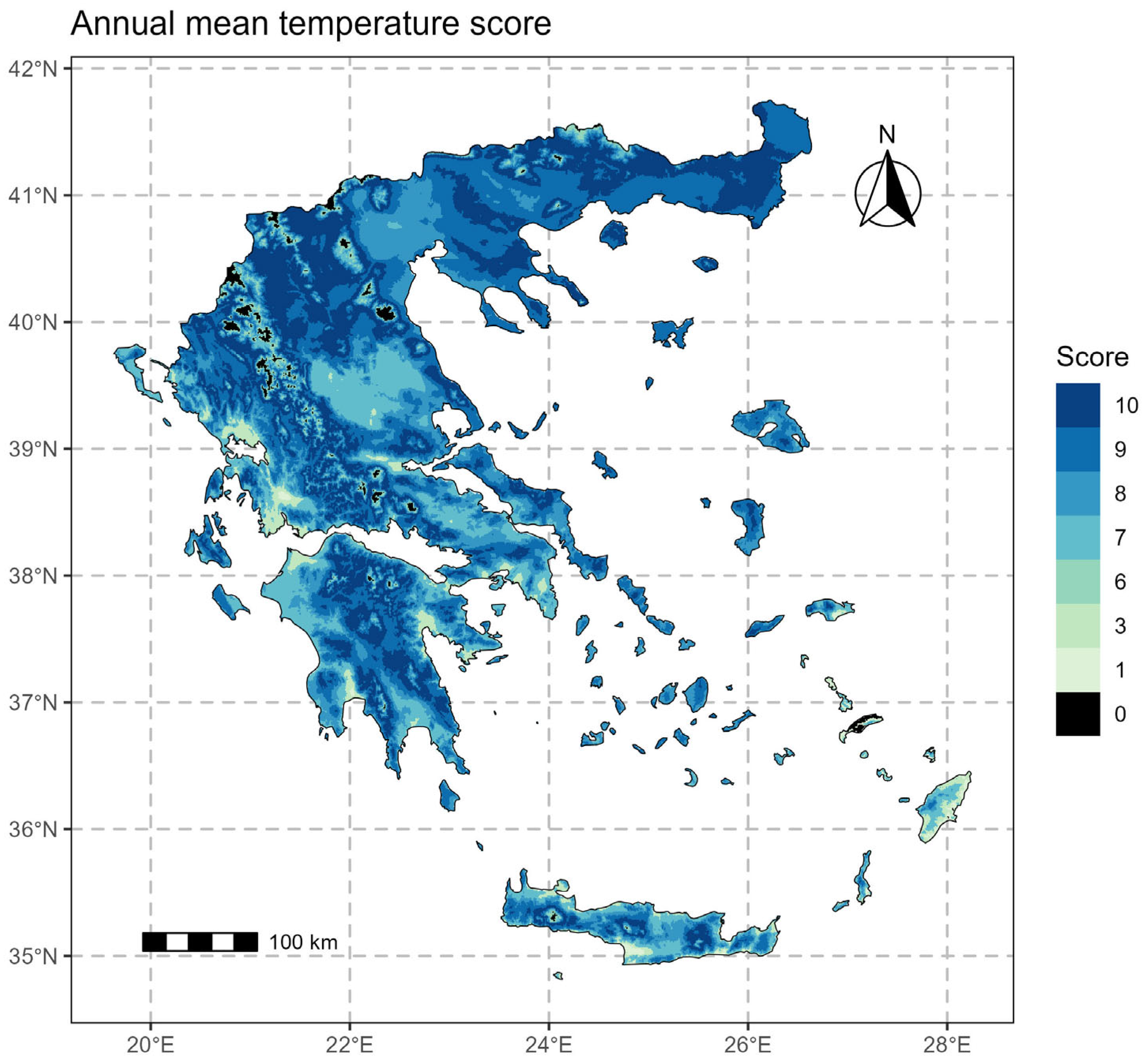 The percentage of Greece’s surface covered by each climatic suitability score.