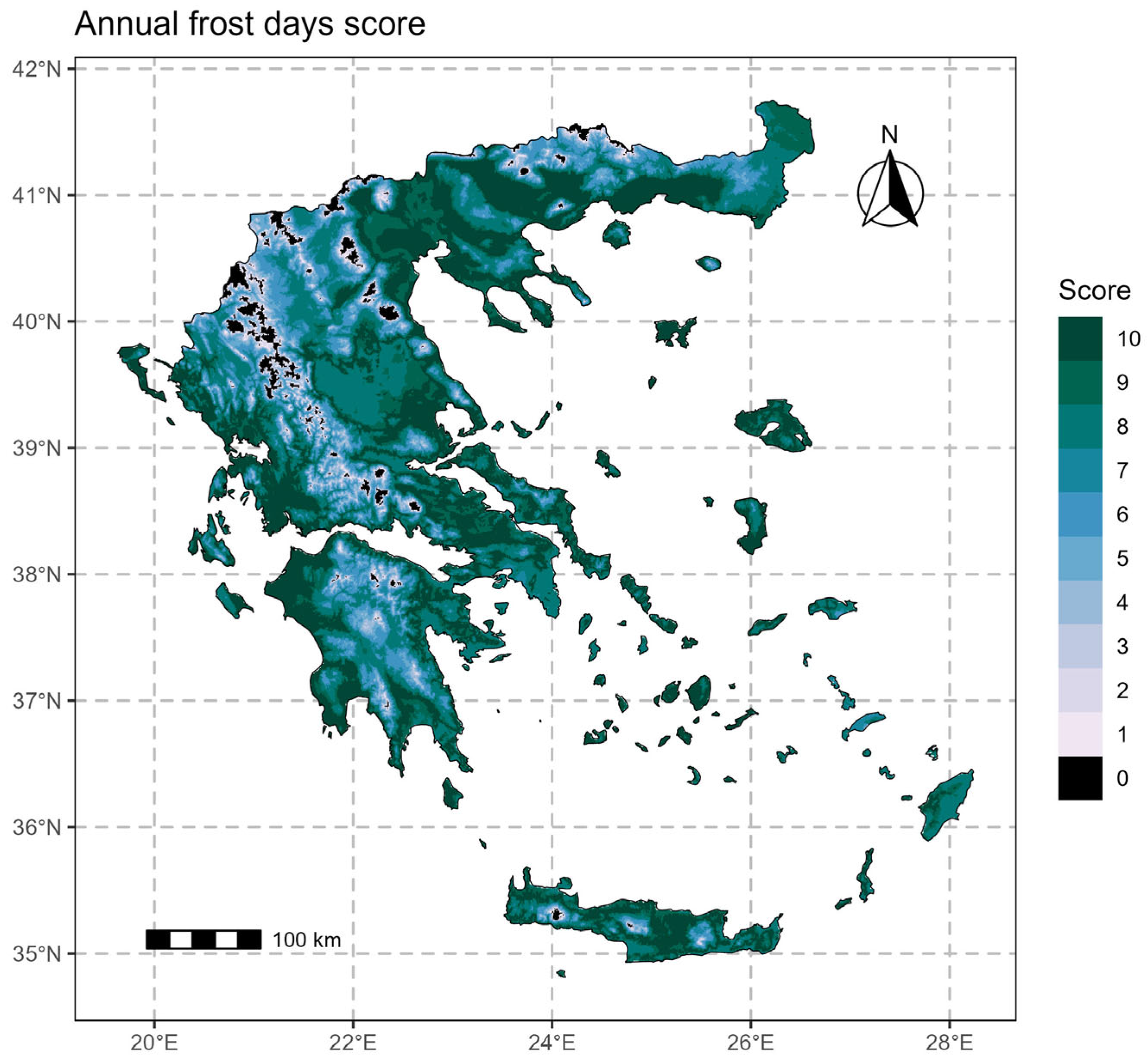 According to the annual frost days map (Figure 8), most satisfactory to optimal scores of 7 to 10 (corresponding to 0 to 20 frost days annually; Table S10) characterize substantial parts of the investigated area. Higher numbers of frost days (20 to 100) occur mainly for upland Greece. In contrast, the restricted number of more than 100 days (score 0; Table S10) corresponds to the mountainous terrain of considerable parts of continental Greece.