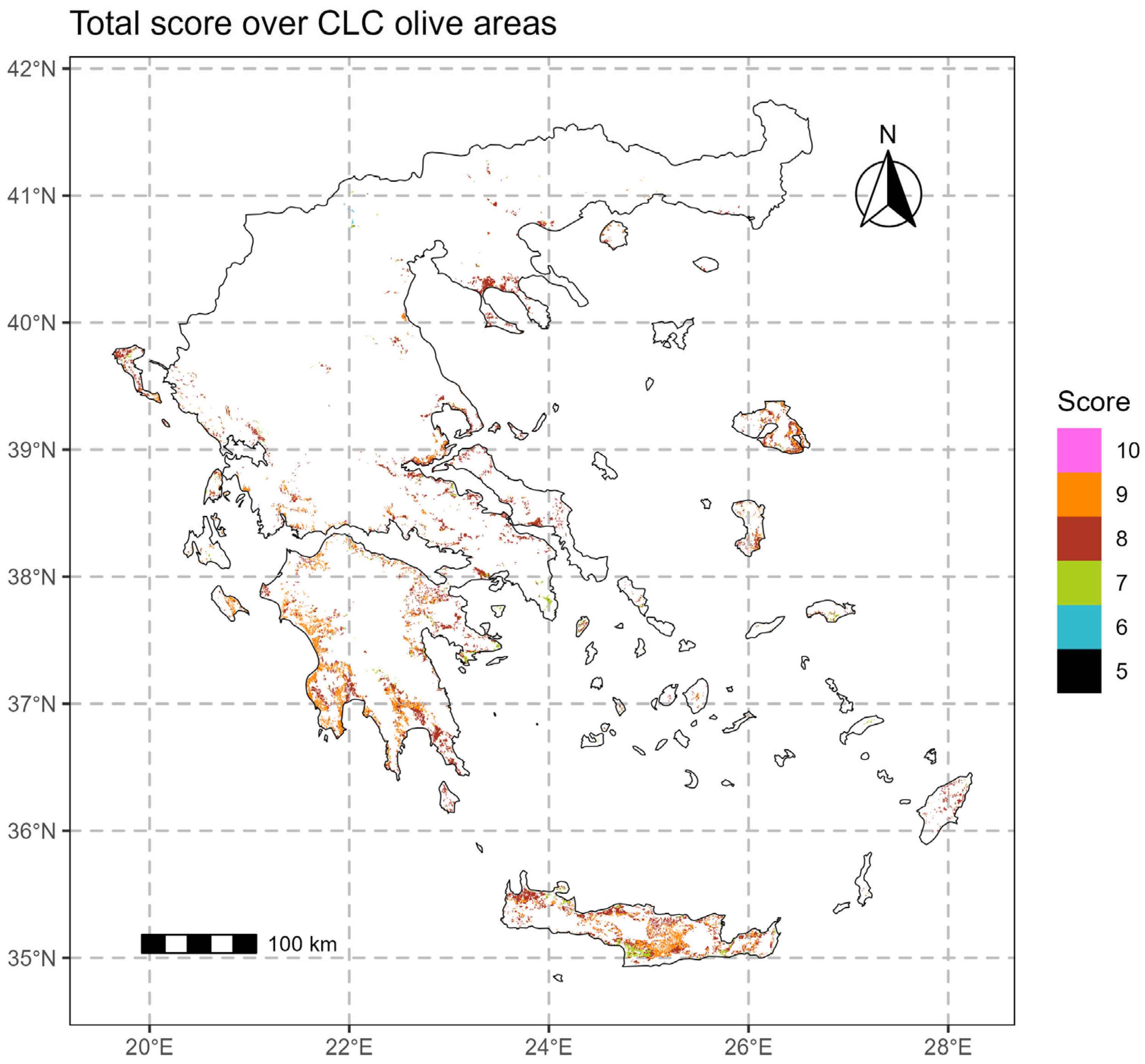 - The observed differences between the model-derived final suitability map and the recorded olive-growing areas in Greece (CLC) may be justified by the application of limited climate and geomorphology components in the model.