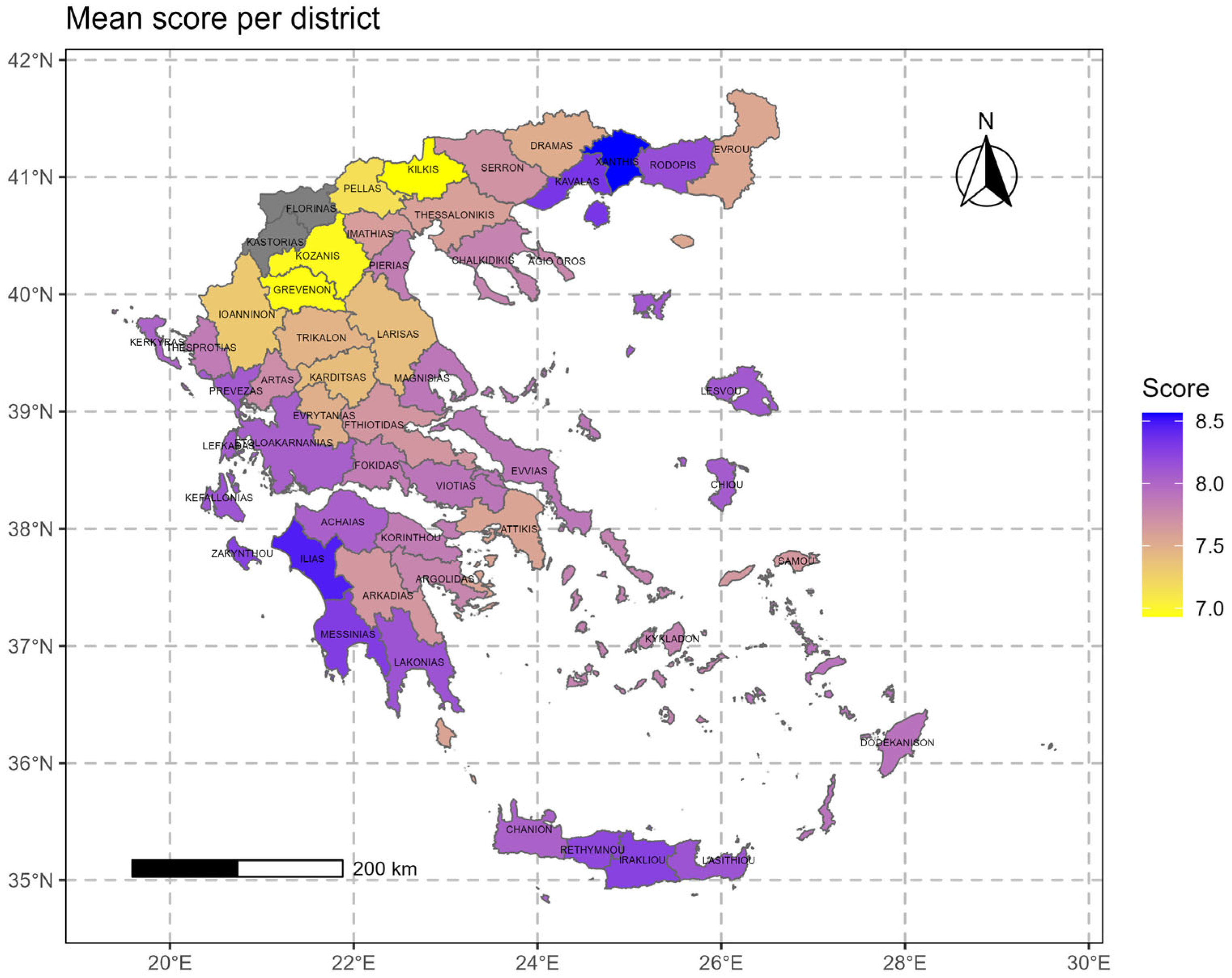 To clarify and enhance the usefulness of these results for policymakers and stakeholders, the mean score per Greece’s district is illustrated in Figure 13. The spatial mean suitability score was calculated, excluding zero values representing unsuitable sites. Higher mean scores are observed in the Xanthis (8.6) and Ilias (8.5) districts, followed by the Messinias, Zakynthou, Irakliou, and Kavalas districts (each at 8.3), as shown in Table S12 of the Supplementary Materials. This calculation covers all areas within each district except locations with zero values. The two grey-colored districts in northern Greece (Florinas and Kastorias) do not display suitability for olive tree cultivation.