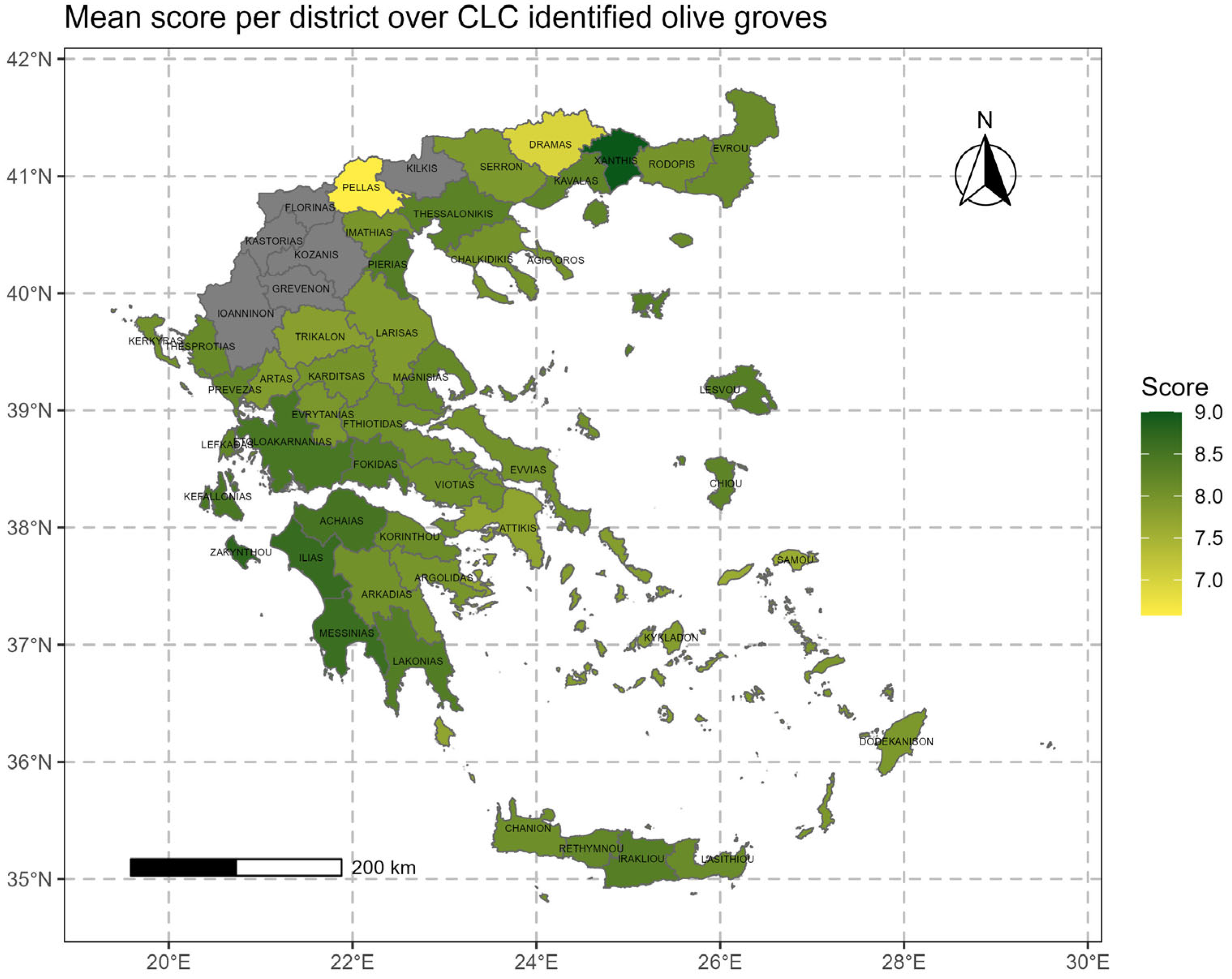 Mean suitability score per district over olive groves according to CLC (grey areas indicate absence of suitability).