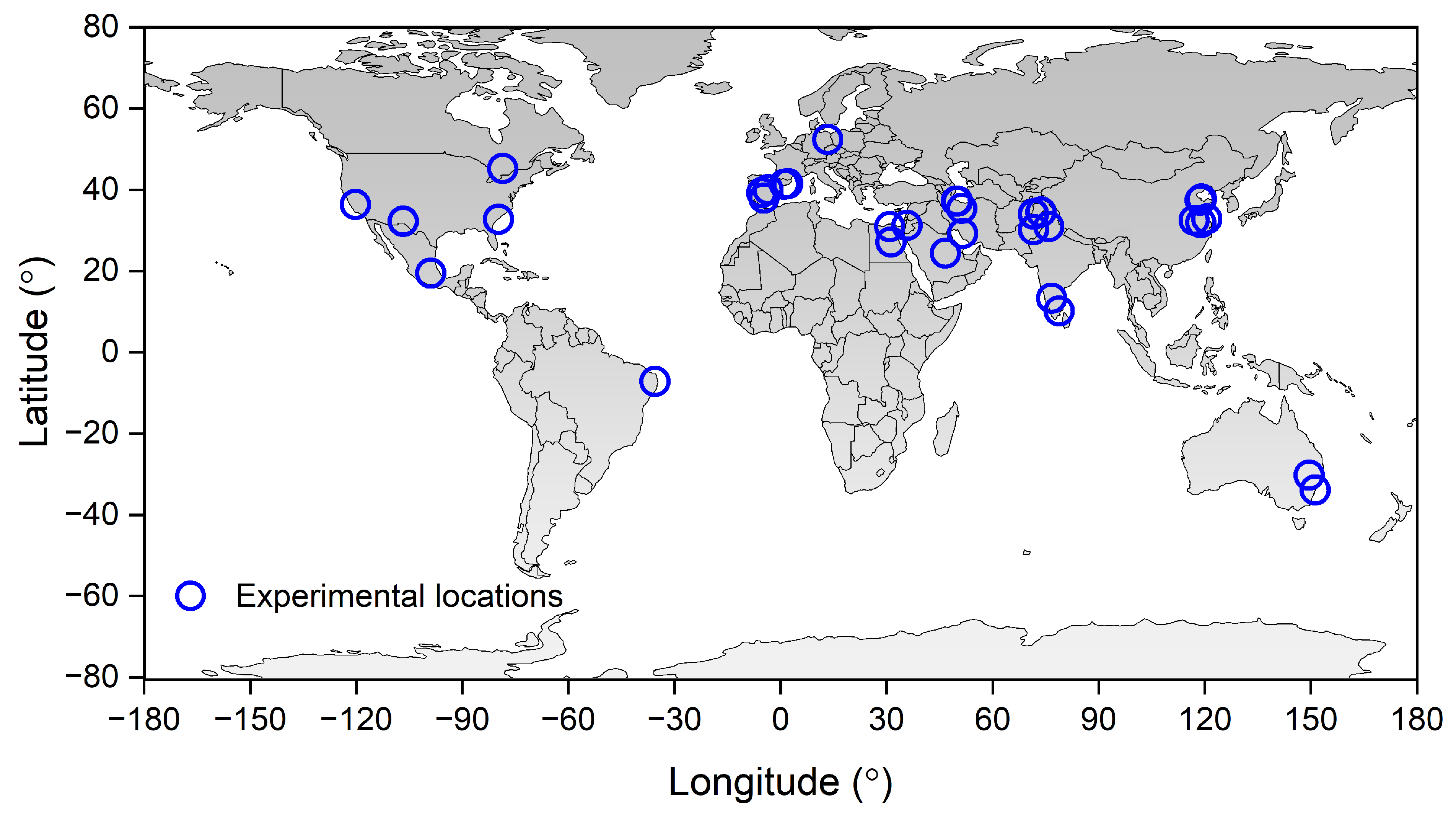 Figure 1. Experimental locations of the 40 studies included in this meta-analysis. Note: The map lines represent study areas and do not necessarily reflect official national boundaries.