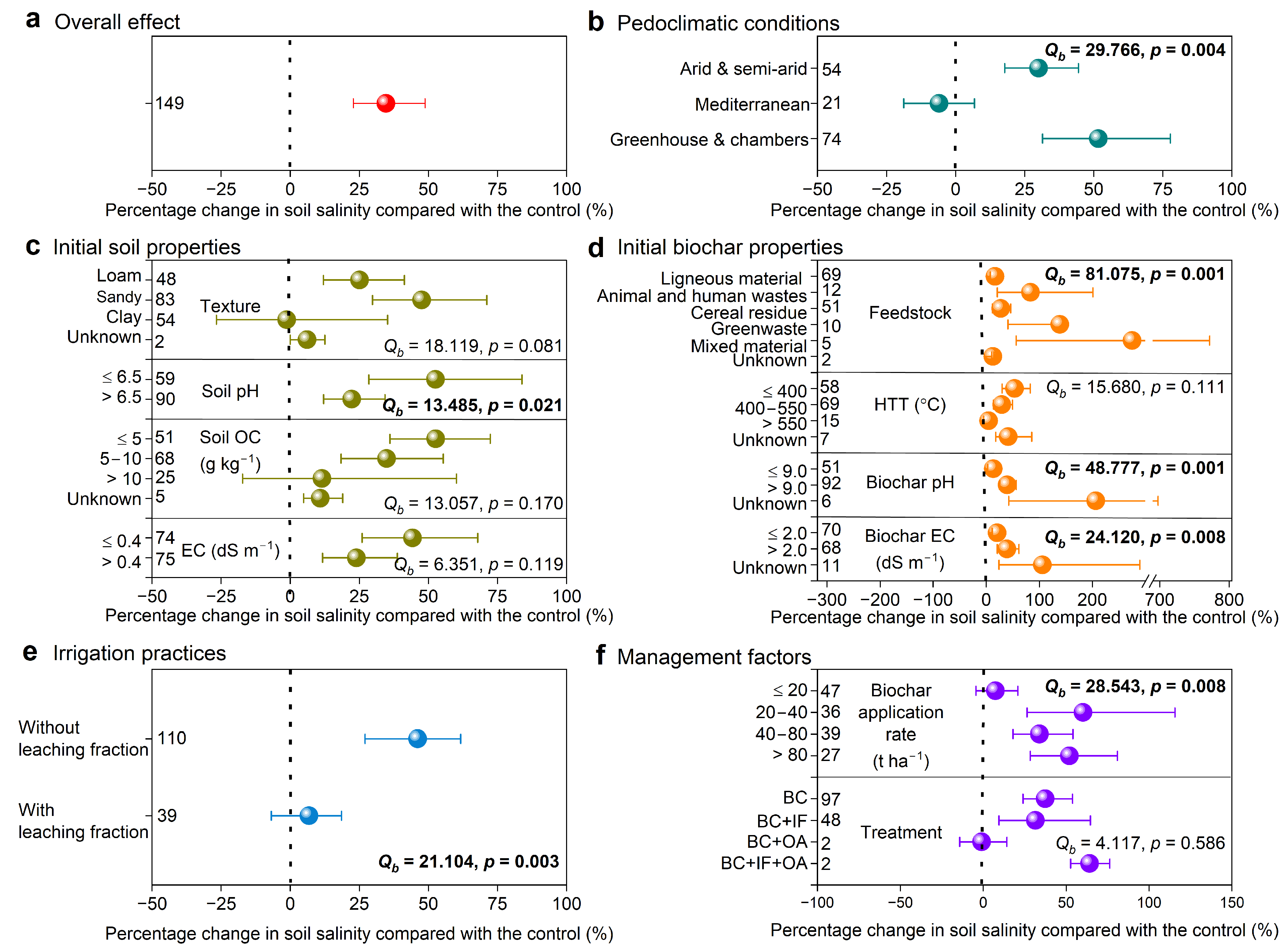 Figure 2. Percentage changes in soil salinity in response to biochar additions, shown for each categorical level relative to the control. The red dotted line represents the overall mean change in soil salinity among all studies. Numbers on the right vertical axis represent the number of pairwise comparisons for each category. A significant between-group heterogeneity (Qb) value (p < 0.05) indicates a statistically significant effect of the categorical variable. EC, electrical conductivity; HHT, pyrolysis highest heating temperature; OC, organic carbon; BC, biochar; BC + IF, biochar + inorganic fertiliser; BC + OA, biochar + organic amendment; BC + IF + OA, biochar + inorganic fertiliser + organic amendment. “Unknown” indicates that no classification information was provided in the selected studies.