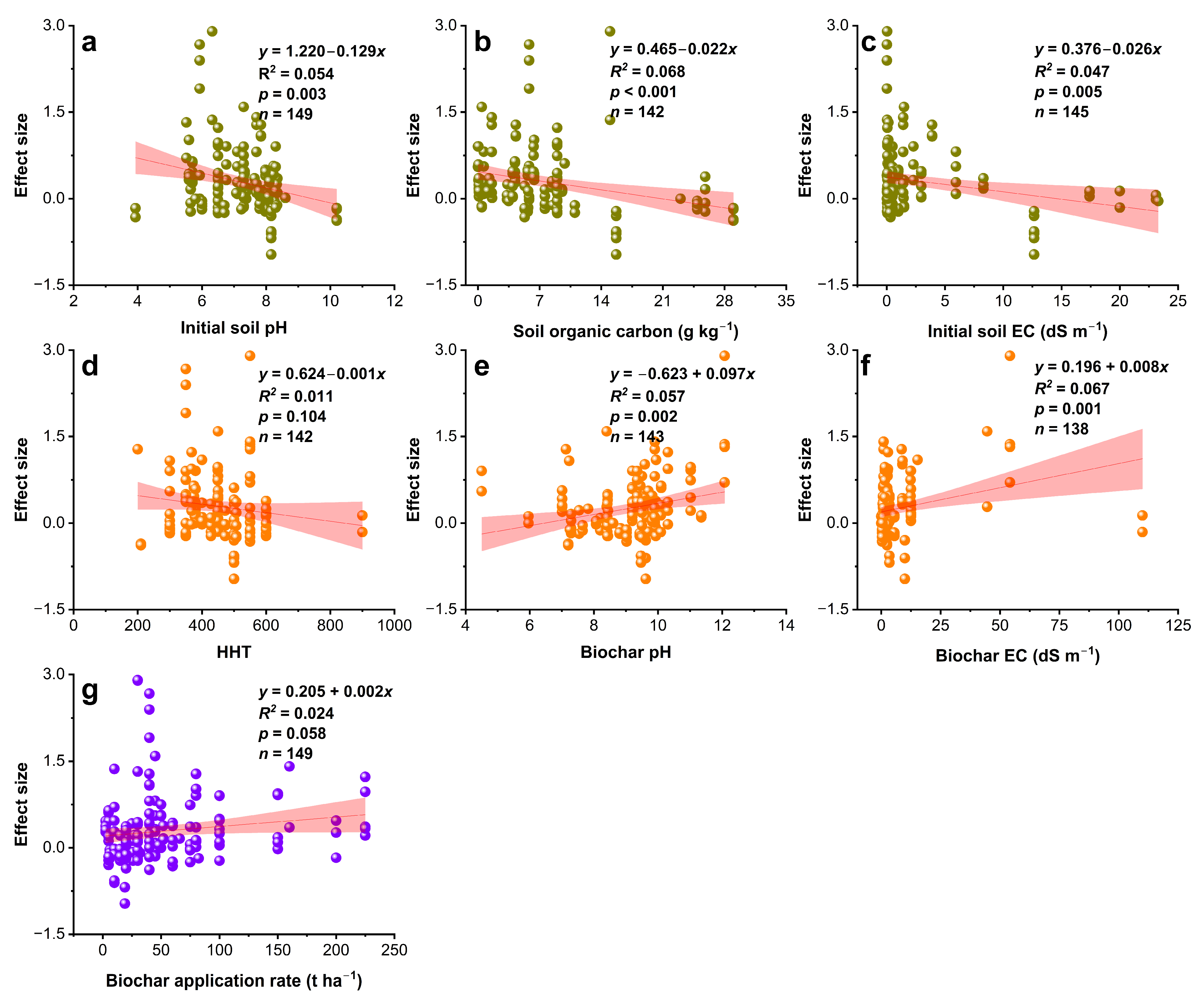 Figure 3. Relationships between the effect size (lnR) of biochar application on soil salinity with initial soil properties (ac), initial biochar properties (df), and management factors (g). EC, electrical conductivity; HHT, pyrolysis highest heating temperature. The shaded areas represent the 95% confidence intervals (95% CIs).