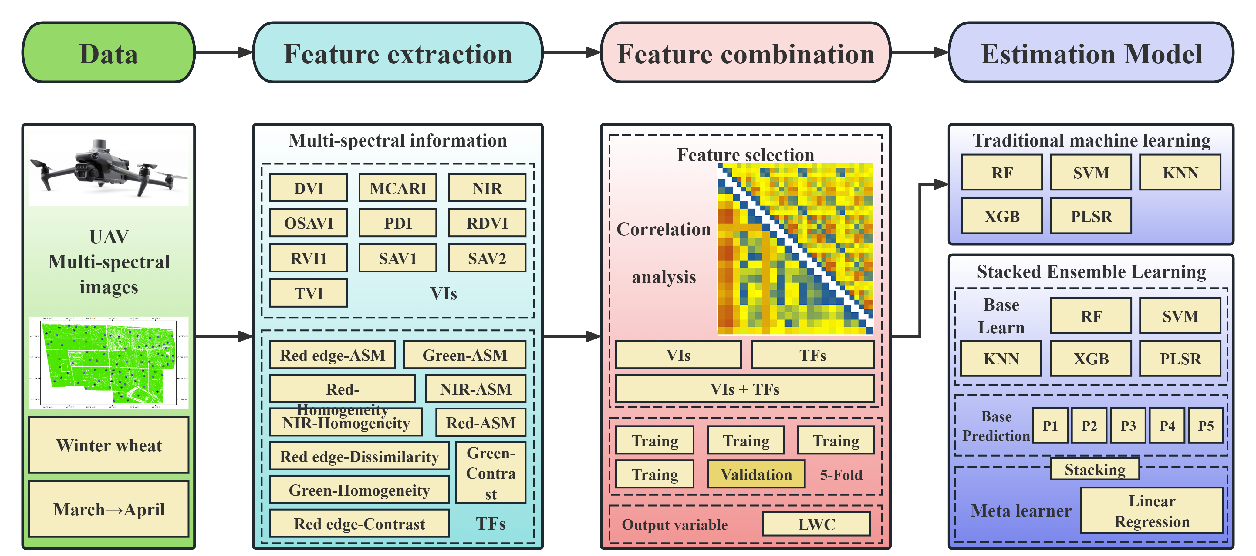 Chicago/Turabian StyleYu, Xingjiao, Long Qian, Kainan Chen, Sumeng Ye, Qi Yin, Lingjia Shao, Danjie Ran, Wen’e Wang, Baozhong Zhang, and Xiaotao Hu. 2025. "Estimating Winter Wheat Leaf Water Content by Combining UAV Spectral and Texture Features with Stacking Ensemble Learning" Agronomy 15, no. 11: 2610. https://doi.org/10.3390/agronomy15112610