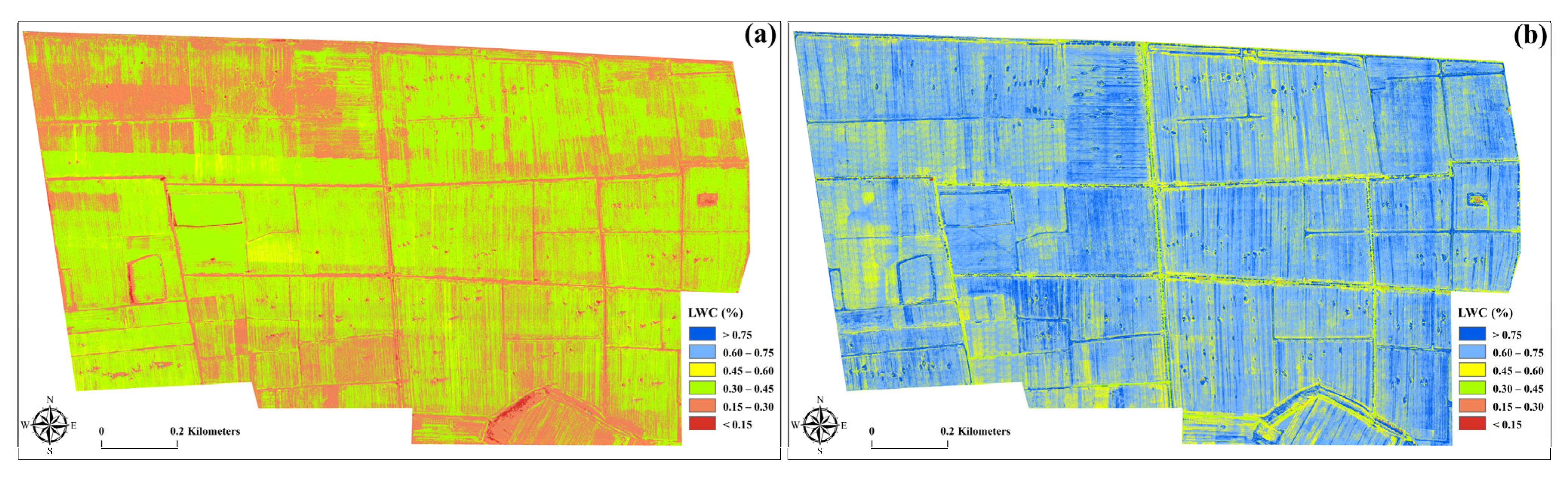 - Wu, Y.L.; Yuan, S.Q.; Zhu, J.J.; Tang, Y.; Tang, L. Estimation of Wheat Leaf Water Content Based on UAV Hyper-Spectral Remote Sensing and Machine Learning. Agriculture 2025, 15, 1898. [Google Scholar] [CrossRef]
