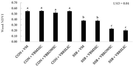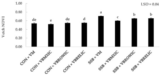 Vetch NDVI was highest (0.71) in the trial units where the stale seedbed was combined with vetch monocropping (SSB × VM). The next highest values corresponded to SSB × VBROWIC and SSB × VBRELIC. Lower values that were below 0.55 were observed in experimental units where weeds were left uncontrolled. Furthermore, the interaction CON × VBRELIC showed a significantly higher vetch NDVI than CON × VBMXIC. CON × VBROWIC and CON × VM tended to improve NDVI compared to CON × VBMXIC, but the differences were not clearly significant. The same pattern was observed when CON × VBRELIC was compared with CON × VBROWIC and CON × VM (Figure 3).