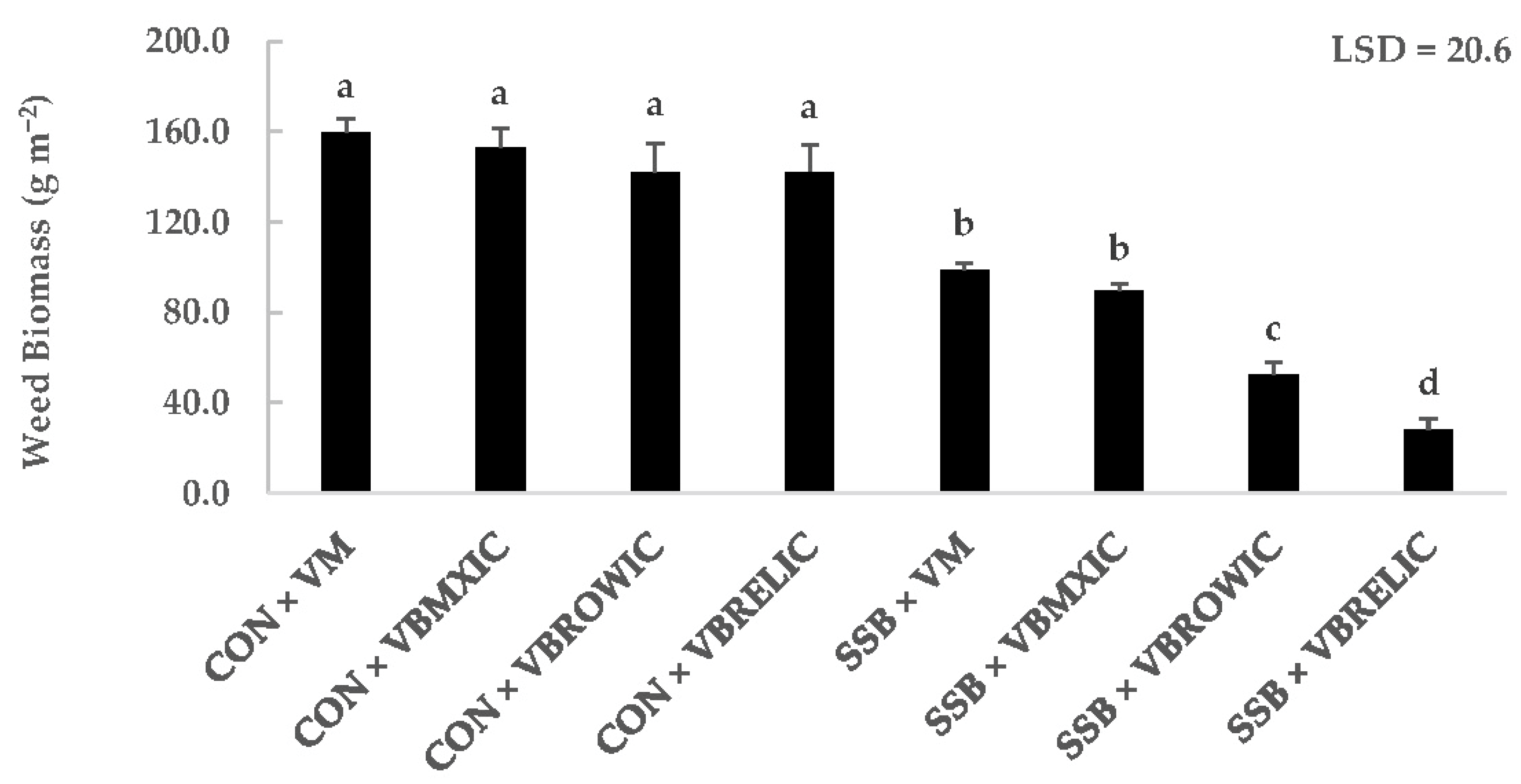 - Gu, C.; Bastiaans, L.; Anten, N.P.; Makowski, D.; van der Werf, W. Annual intercropping suppresses weeds: A meta-analysis. Agric. Ecosyst. Environ. 2021, 322, 107658. [Google Scholar] [CrossRef]