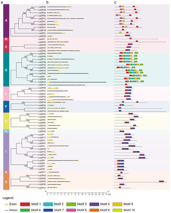 Phylogenetic relationships, gene structures, and conserved protein motifs of LrbZIP genes. (a) NJ phylogenetic tree of LrbZIP family members. The letters A–I, K, and S represent the subgroup classifications corresponding to the homologous subfamilies previously defined in Arabidopsis thaliana. (b) Exon–intron organization. Yellow boxes represent coding sequences (CDSs), and gray lines between boxes indicate introns. (c) Distribution and composition of conserved protein motifs in LrbZIP members.