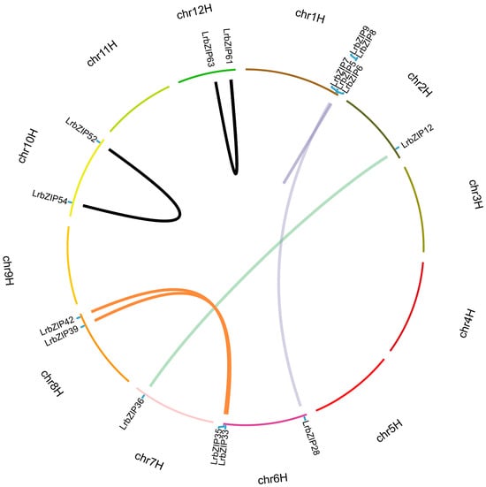 Chromosomal distribution and gene duplication events of LrbZIP genes.