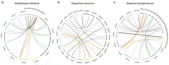 Synteny analysis of LrbZIP genes with C. annuum, S. lycopersicum, and A. thaliana. (a) A. thaliana (b) C. annuum (c) S. lycopersicum.