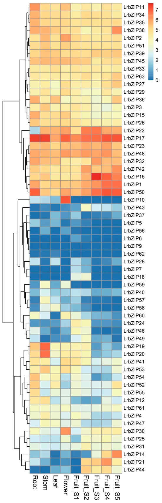 Expression profiles of LrbZIP genes across different tissues or developmental stages in L. ruthenicum. FPKM values were log2(FPKM + 1) transformed for normalization.