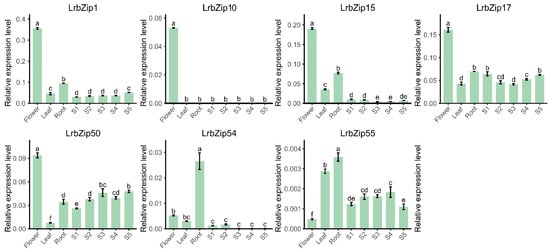 Expression levels of seven LrbZIP genes in flowers, leaves, roots, and five fruit developmental stages. Lowercase letters above columns indicate significant differences (p < 0.05, LSD test). LSD, least significant difference.