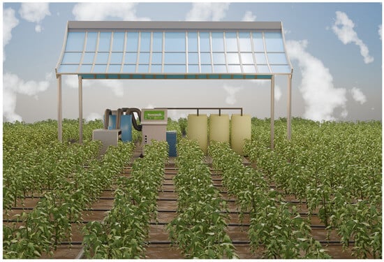 In traditional irrigation practices, the integration of MNBs with drip irrigation technology has been shown not only to enhance crop yield and plant stress resistance (the scenario diagram is shown in Figure 3), but also to sustainably promote growth across all stages of crop development. This approach significantly improves maize’s phosphorus uptake efficiency, partial factor productivity of phosphorus, and agronomic use efficiency of phosphorus []. When delivered via subsurface drip irrigation, micro-nano bubble hydrogen (MNBH) water markedly increases yield, plant height, and root morphological characteristics in water spinach (Ipomoea aquatica Forssk). It also boosts chlorophyll content, photosynthetic rate, and levels of metallothionein and stress-responsive plant hormones such as abscisic acid (ABA) and salicylic acid (SA), thereby enhancing the plant’s tolerance to cadmium (Cd) stress. Furthermore, MNBH application improves the rhizosphere soil environment by modulating pH and enzyme activity, and reshapes the soil microbial community structure []. The integration of MNBs aeration with subsurface drip irrigation enhances soil aeration by 5%, promoting plant dry matter accumulation, increasing crop yield, and improving the concentration of soluble solids and sugars in fruits through enhanced tomato leaf photosynthesis. This approach effectively mitigates the negative impacts associated with a 25% reduction in nitrogen topdressing []. Furthermore, the combined use of MNBs and humic acid (HA) alleviates drought stress-induced limitations on tomato yield []. The synergistic application of biochar and micro-nano bubble water (MNBW) improves soil aeration and aeration porosity, thereby stimulating cucumber root development and photosynthetic activity, which contributes to greater dry matter accumulation []. In rice cultivation, applying three different concentrations of MNBW, compared to conventional tap water, significantly increases dissolved oxygen levels in the soil solution. This improvement supports the growth of various plant organs, enhances nitrogen uptake and utilization efficiency, and ultimately boosts grain yield in double-cropping rice systems [].