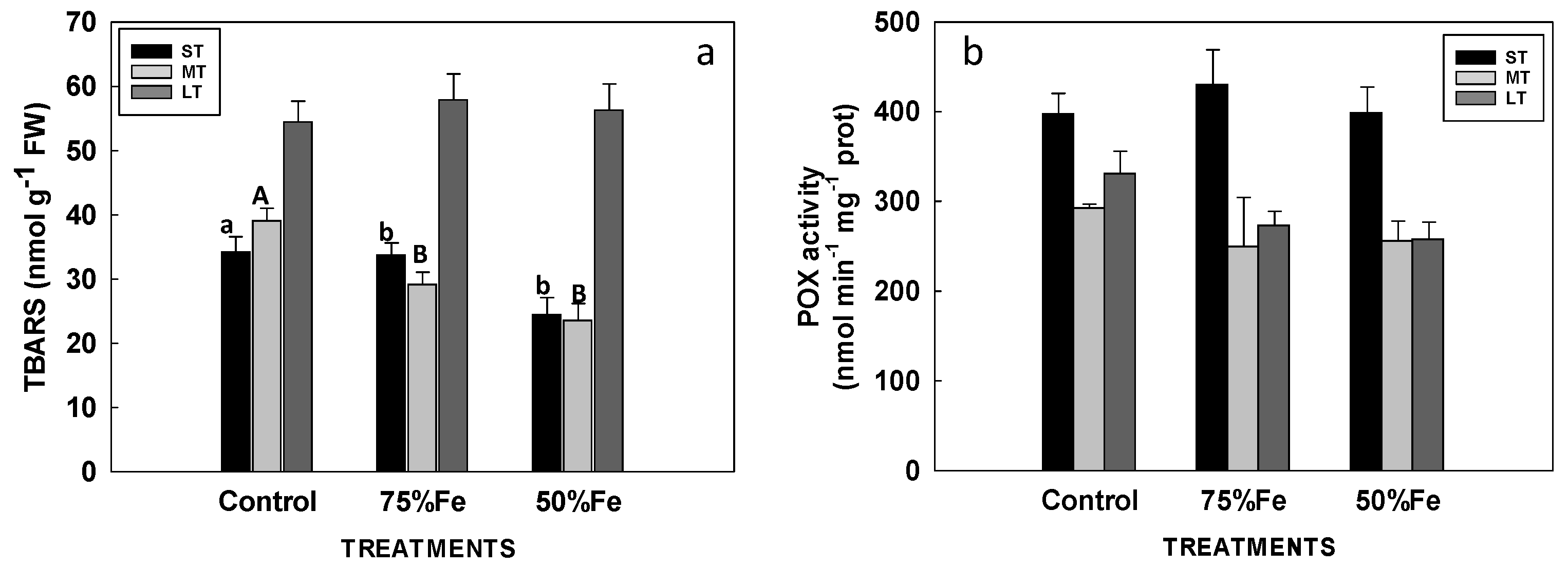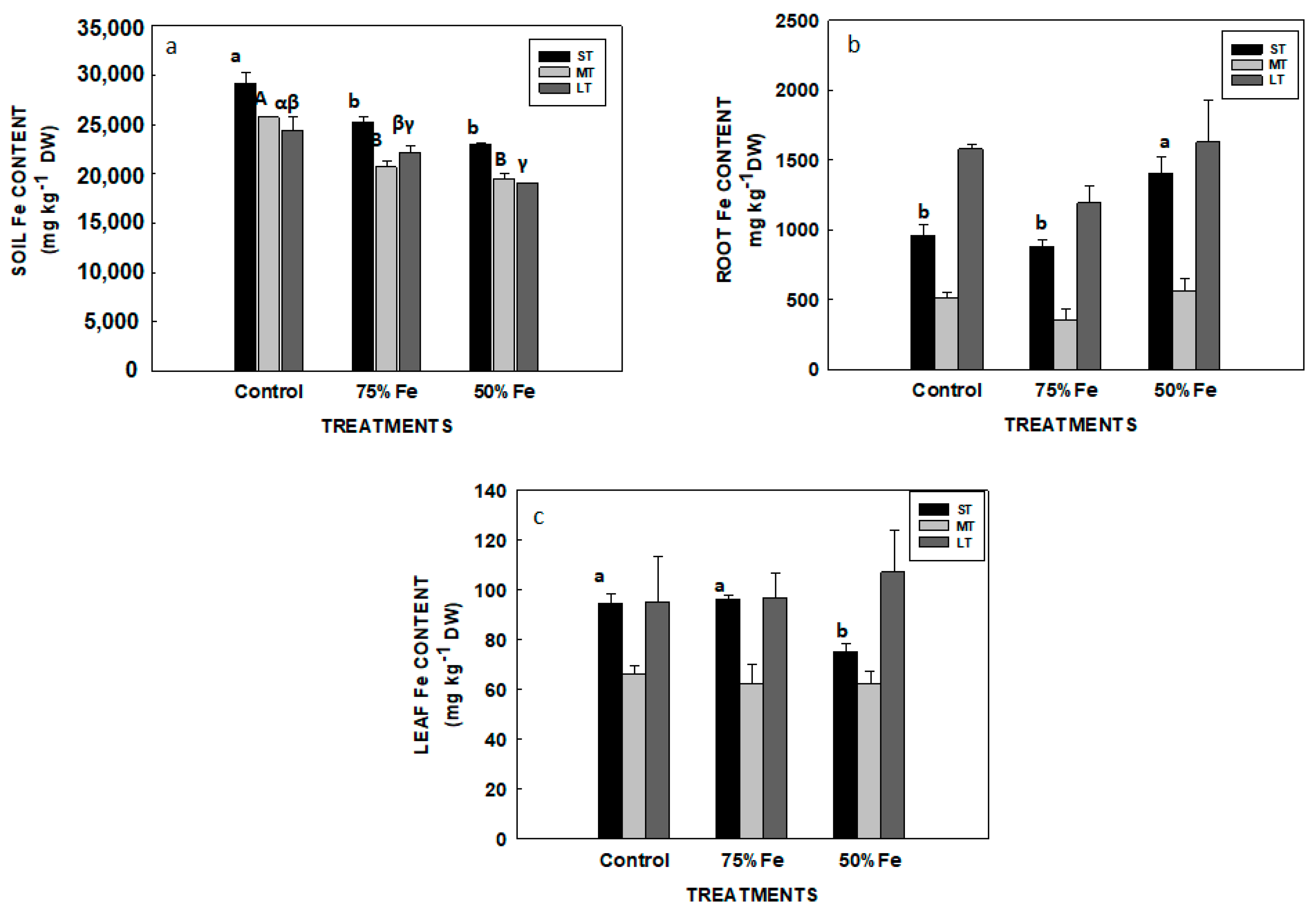 | 50% Fe | 17,520 ± 2745 ab | 11.10 ± 1.73 a | 31.23 ± 7.00 a | 1770 ± 158 a | 523 ± 149 | 2860 ± 166 a | 892 ± 54 | 61.64 ± 4.71 a | 0.19 ± 0.01 a | 11.25 ± 4.48 a | 5.37 ± 0.179 ab | 1.56 ± 0.56 ab |