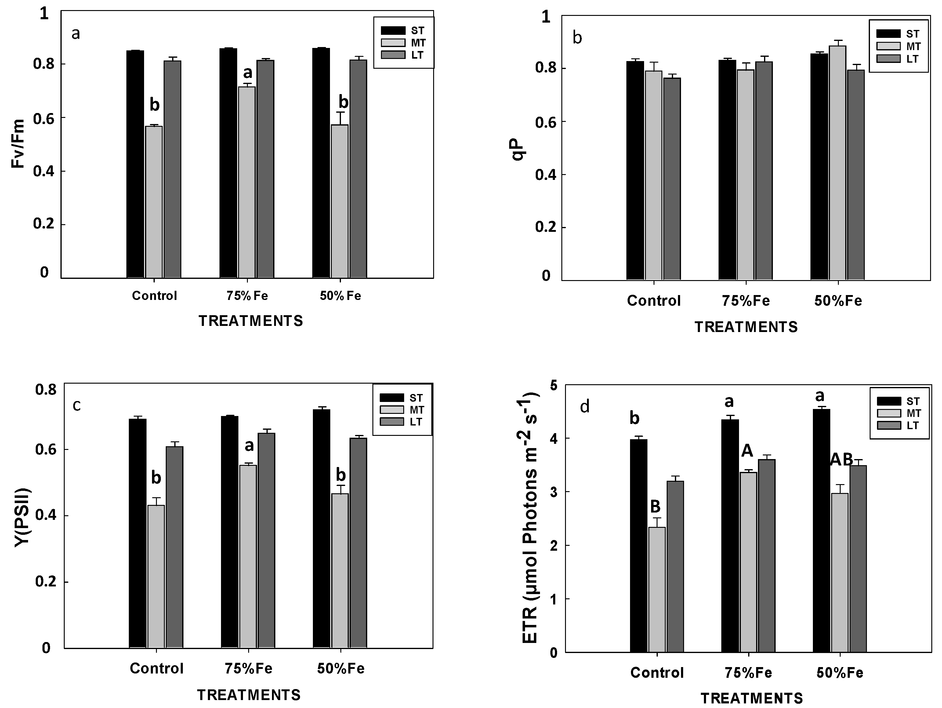 - Larbi, A.; Abadía, A.; Abadía, J.; Morales, F. Down co-regulation of light absorption, photochemistry, and carboxylation in Fe-deficient plants growing in different environments. Photosynth. Res. 2006, 89, 113–126. [Google Scholar] [CrossRef]