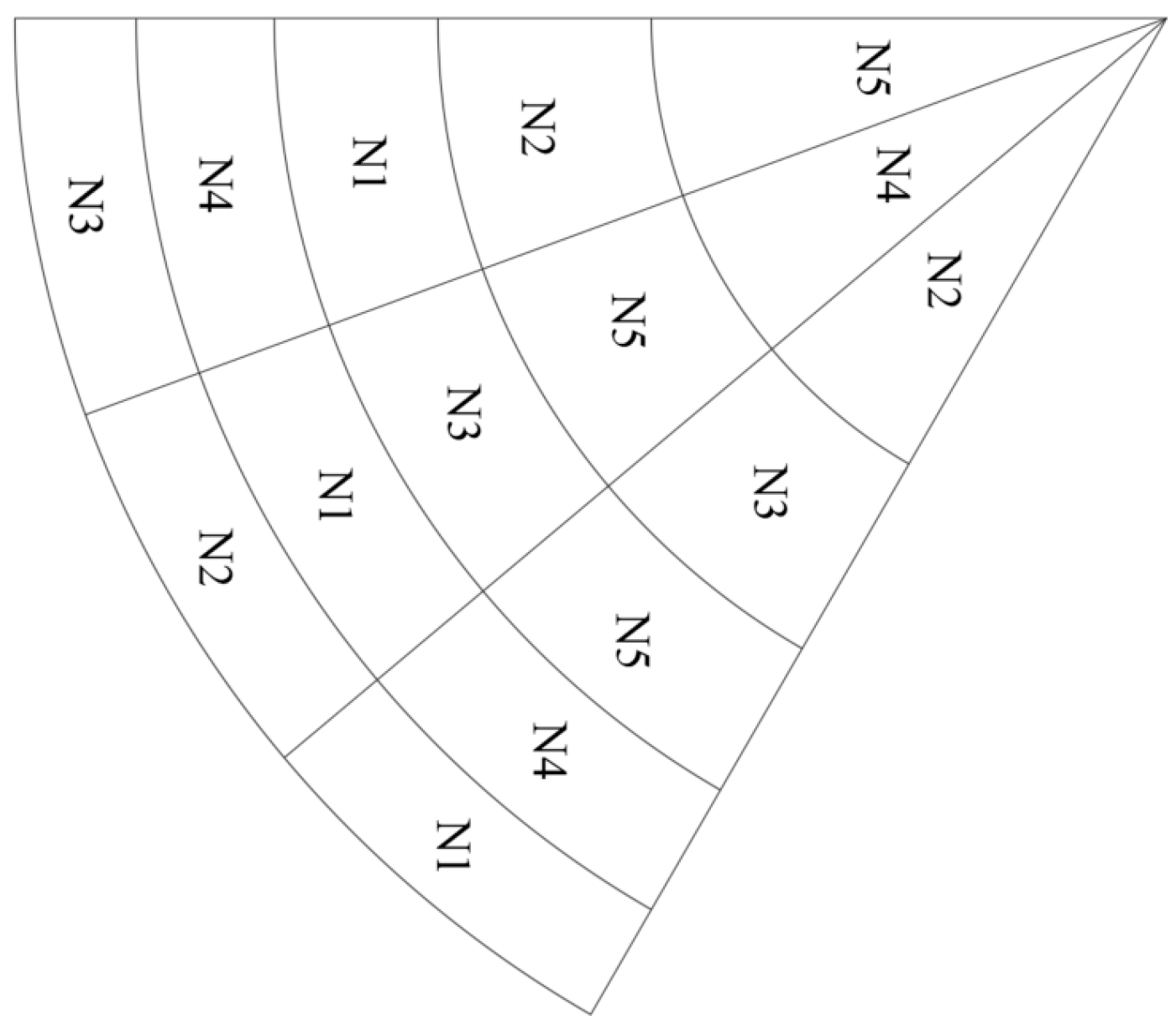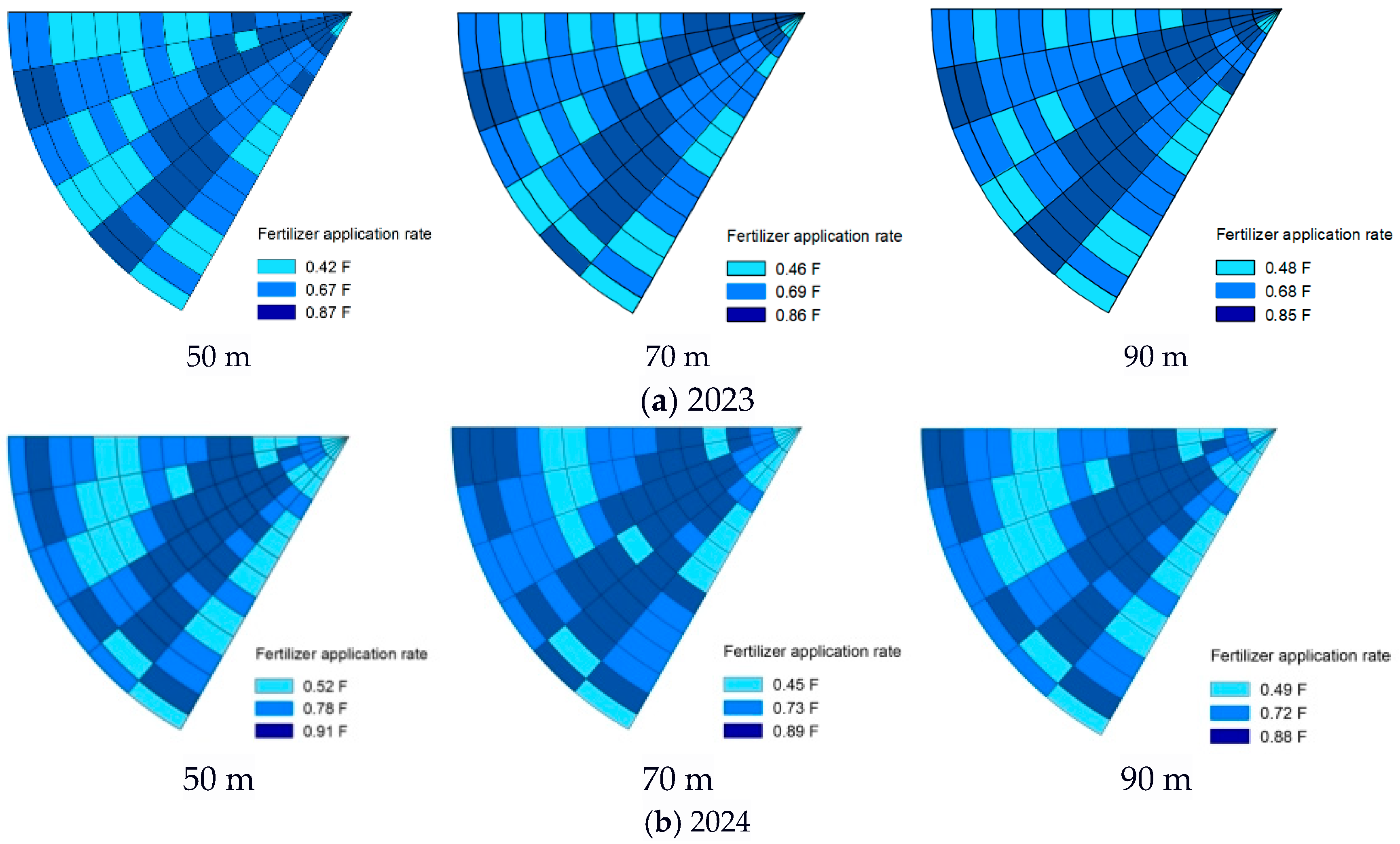 - According to the water application distribution characteristics of the center pivot irrigation system, a map of the management subzones was delineated. To ensure irrigation uniformity, management zones along the truss direction were designed as concentric rings centered on the central pivot, each comprising four adjacent sprinklers. Along the travel direction, the 60° control area was equally divided at 10° intervals, resulting in 90 management subzones [3].