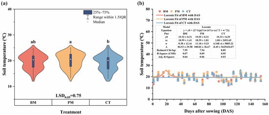 Effects of different treatments on soil temperature during the maize growth period. (a) Violin plots showing the distribution of soil temperature under each treatment throughout the maize growing season. (b) Temporal variation in soil temperature (days after sowing, DAS) under different mulching treatments. BM, conventional tillage with biodegradable plastic film mulching. PM, conventional tillage with polyethylene plastic film mulching. CT, conventional tillage without mulching. One-way analysis of variance (ANOVA) was used to assess the effects of treatment on soil temperature. Different lowercase letters indicate no significant differences among treatments at the 0.05 probability level (LSD0.05 = 0.75).