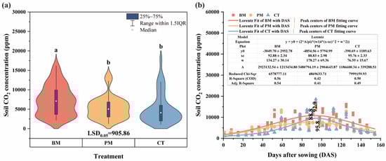 Effects of different treatments on soil CO2 concentration during the maize growth period. (a) Violin plots showing the distribution of all measured soil CO2 concentrations under each treatment throughout the maize growing season. (b) Temporal dynamics of soil CO2 concentration (days after sowing, DAS) under different mulching treatments. BM, conventional tillage with biodegradable plastic film mulching. PM, conventional tillage with polyethylene plastic film mulching. CT, conventional tillage without mulching. One-way analysis of variance (ANOVA) was used to assess the effects of treatment on soil CO2 concentration. Different lowercase letters indicate significant differences among treatments at the 0.05 probability level (LSD0.05 = 905.86). Different lowercase letters indicate significant differences between different treatment (p < 0.05).