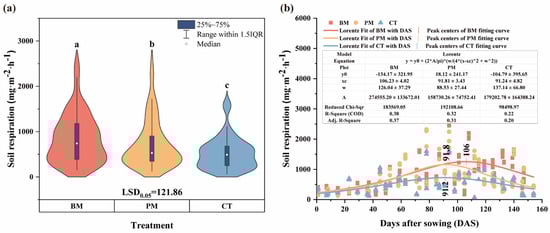 The temporal dynamics of SR are shown in Figure 4b. Lorentz function fitting effectively captured the seasonal respiration patterns, with peak timing at 106 DAS under BM, 91.8 DAS under PM, and 91.2 DAS under CT. Notably, BM exhibited the largest peak width and the greatest area under the curve, suggesting more prolonged and intensive respiration activity. The goodness-of-fit was acceptable, with R2 values ranging from 0.20 under CT to 0.37 under BM.
