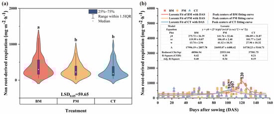 Effects of different treatments on non-root-derived respiration during the maize growth period. (a) Violin plots showing the distribution of non-root-derived respiration under each treatment throughout the maize growing season. (b) Temporal variation in non-root-derived respiration (days after sowing, DAS) under different mulching treatments. BM, conventional tillage with biodegradable plastic film mulching. PM, conventional tillage with polyethylene plastic film mulching. CT, conventional tillage without mulching. One-way analysis of variance (ANOVA) was used to assess the effects of treatment on non-root-derived respiration. Different lowercase letters indicate significant differences among treatments at the 0.05 probability level (LSD0.05 = 59.65).