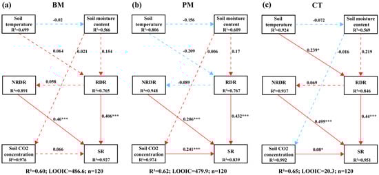 Significant direct paths (p < 0.05) included positive effects from soil volumetric water content to SCC (standardized path coefficient = 0.289), soil volumetric water content to RDR (0.128), SCC to SR (0.139), RDR to SR (0.283), NRDR to SR (0.409), and RDR to NRDR (0.047). Treatments exerted significant direct effects on multiple variables: BM negatively affected soil volumetric water content (−0.277,) but positively influenced SCC (6.402), RDR (1.963), NRDR (3.314), and SR (4.032); PM positively affected soil volumetric water content (0.210), SCC (6.233), RDR (1.830), NRDR (3.095), and SR (4.071); CT positively influenced SCC (6.096), RDR (1.729), NRDR (3.079), and SR (3.972). No significant direct effects were observed from treatments to soil temperature (all p > 0.05) or from soil temperature to soil volumetric water content and RDR. From CT to soil volumetric water content was also non-significant.