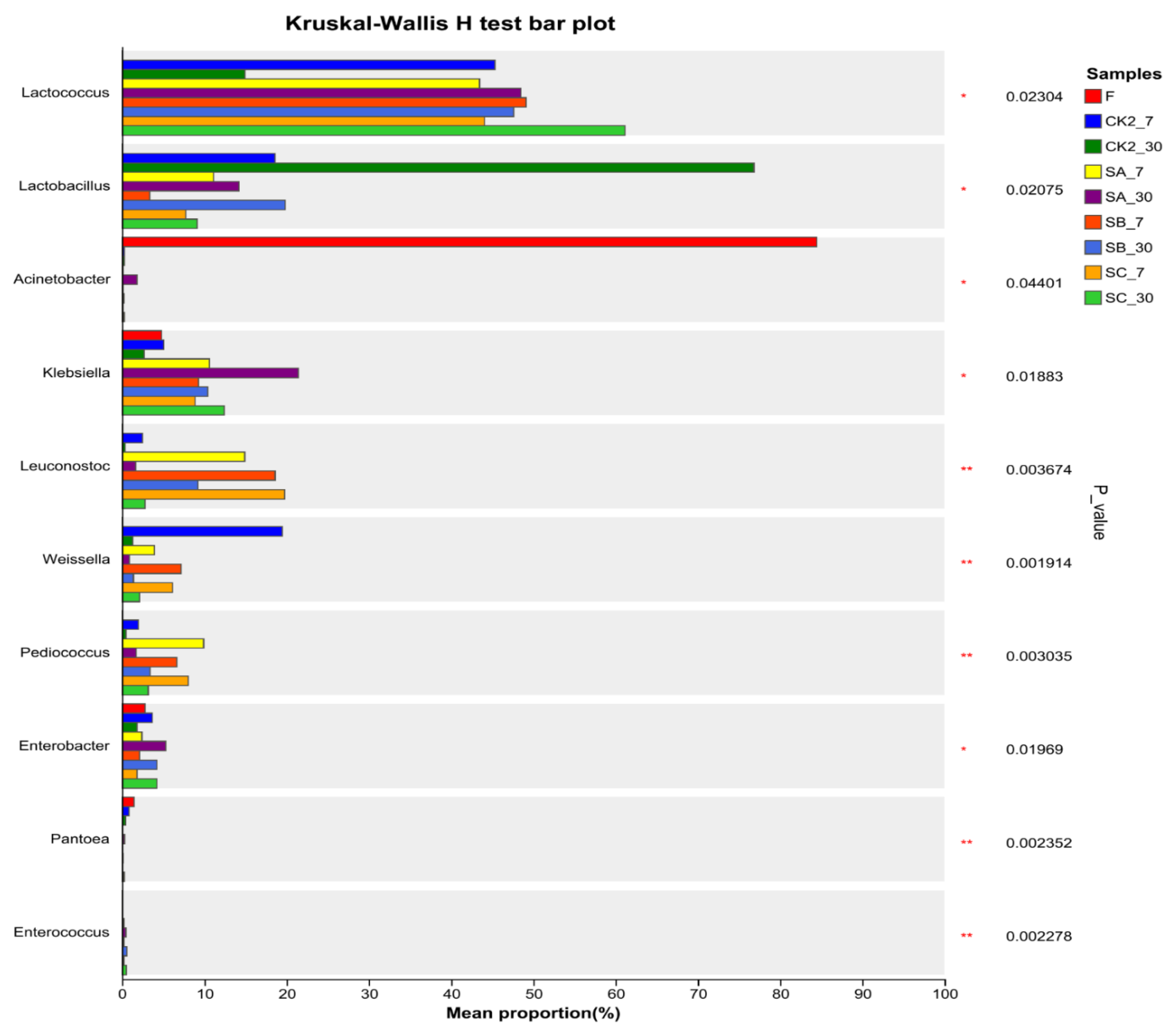 | LAB (Log10 CFU/g FW) | CK | 9.65 ABa | 9.38 a | 9.57 a | 8.62 b | 7.01 c | 0.261 | 0.095 | <0.001 | 0.182 | <0.001 | <0.001 |