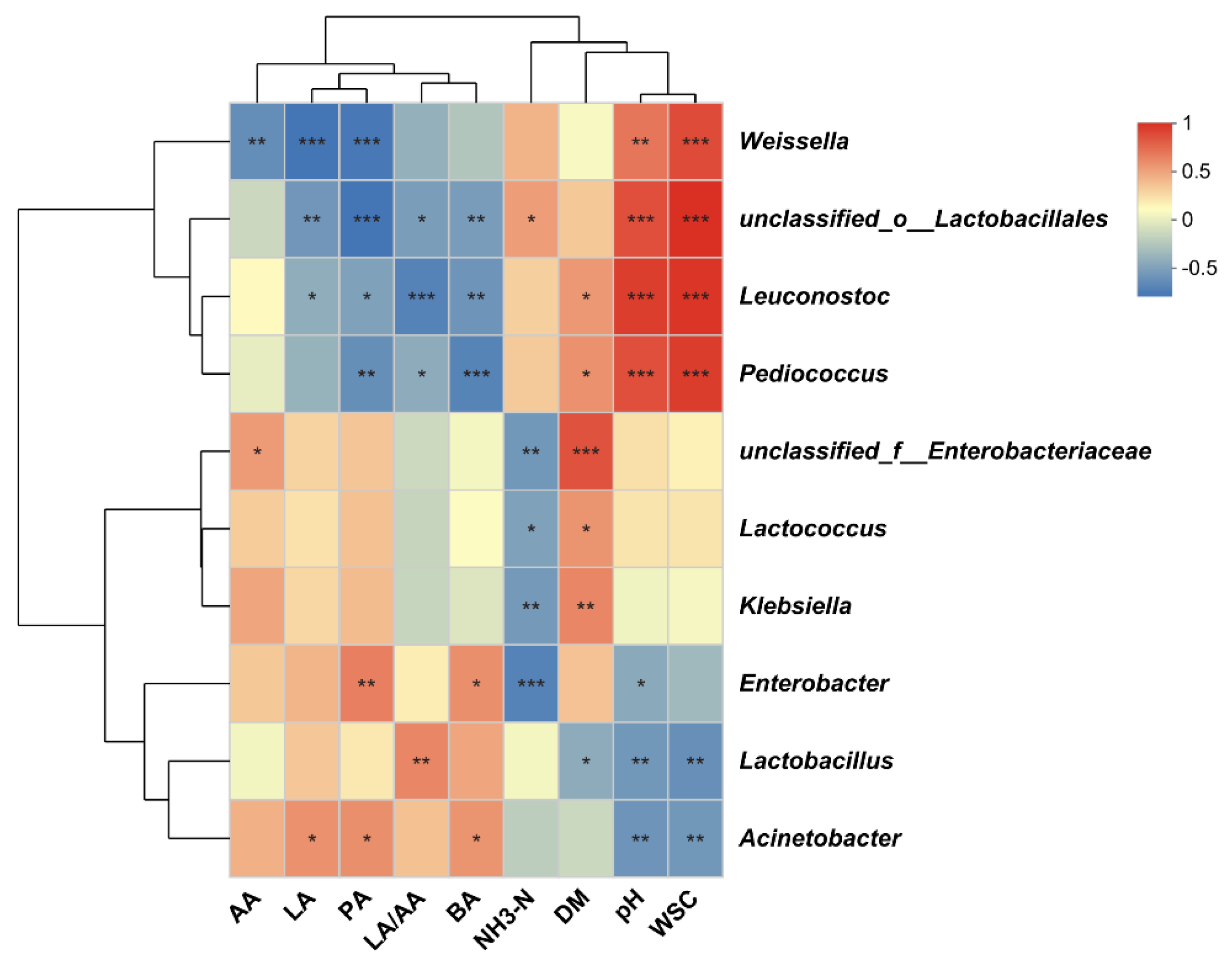 3.5. Correlation Analysis Between Bacterial Community Genus and Fermentation Indices