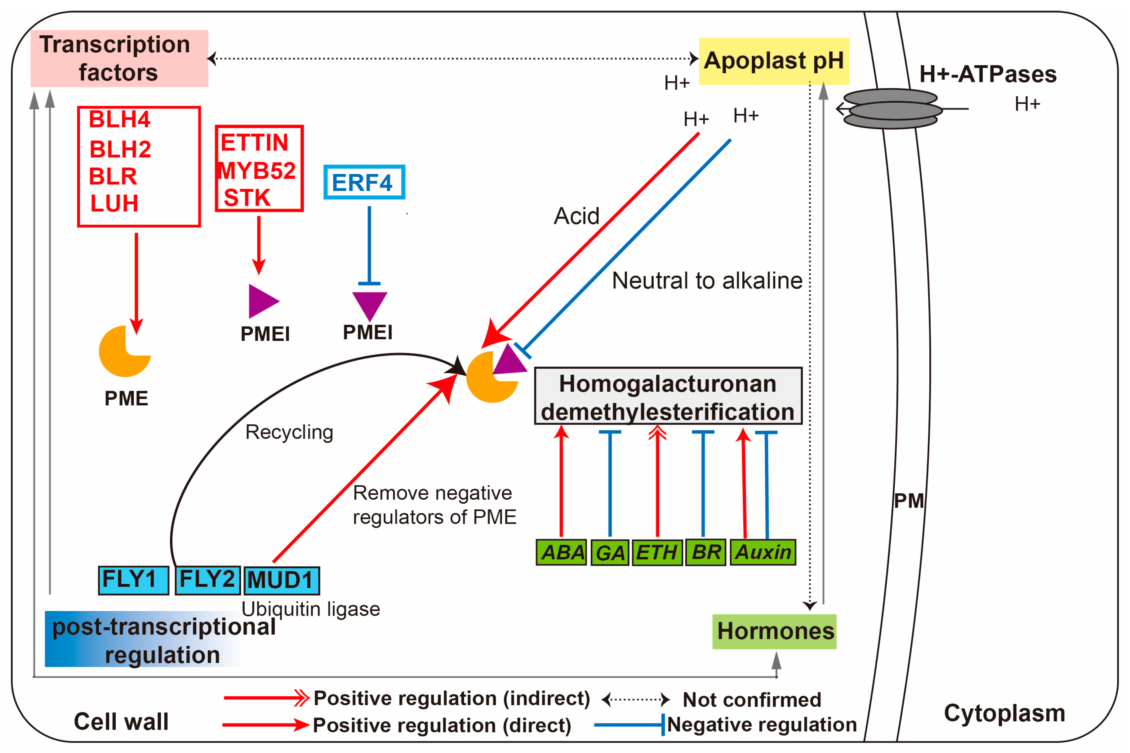 | Auxin | Promotes or inhibits demethylesterification | PME, PMEI | Phyllotactic patterning, root emergence, hypocotyl elongation | [34,35,36,37] |