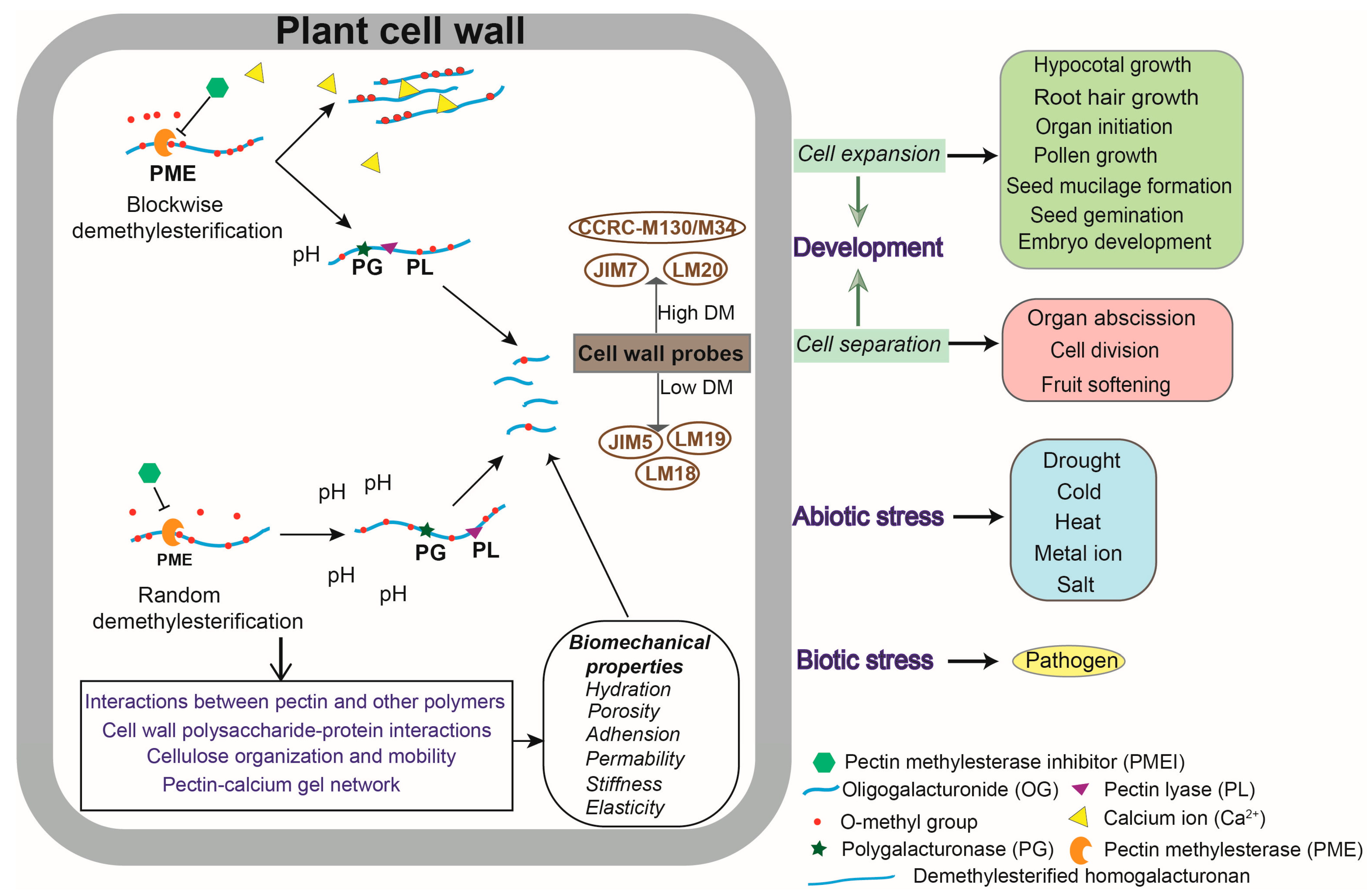 - Grandjean, C.; Voxeur, A.; Chabout, S.; Jobert, F.; Gutierrez, L.; Pelloux, J.; Mouille, G.; Bouton, S. Fine-tuning and remodeling of pectins play a key role in the maintenance of cell adhesion. Front. Plant Physiol. 2024, 2, 1441158. [Google Scholar] [CrossRef]