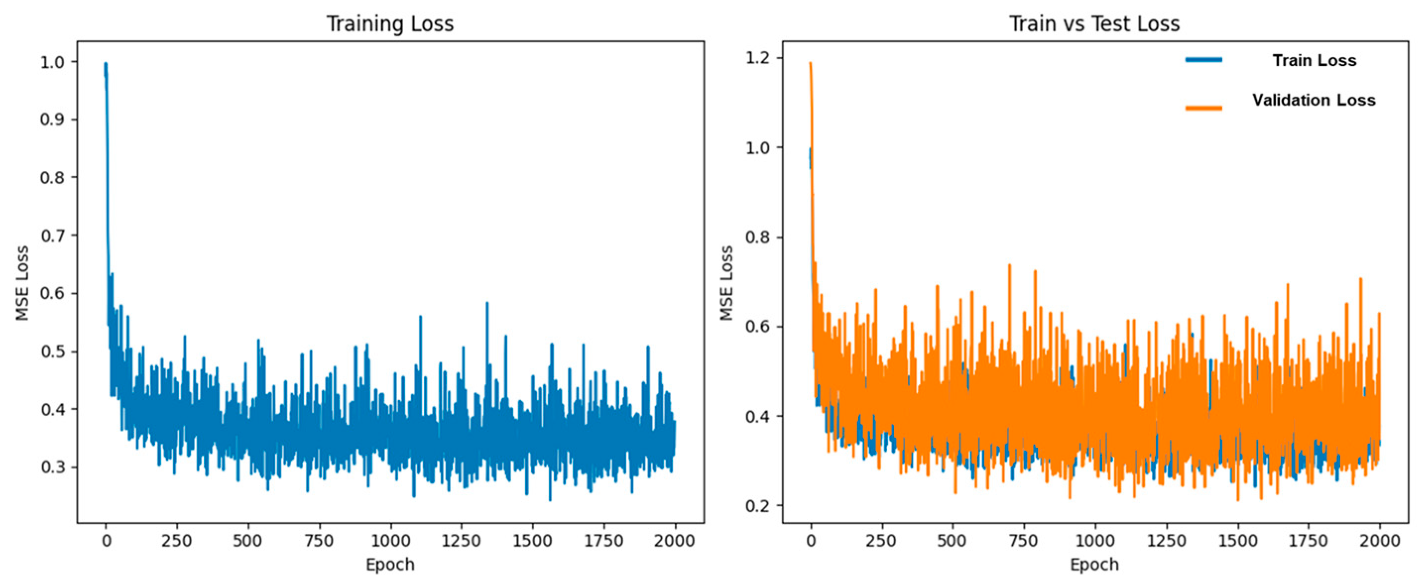The NIR dataset of leek samples was first randomly divided into training and testing subsets with an 8:2 ratio. This splitting procedure was repeated three times using different random seeds to better assess the robustness of the results. The testing subset was reserved exclusively for downstream regression tasks to evaluate the predictive performance of generated spectra with real samples. Within the 80% training portion, the data were further split into training and validation sets (7:3) for optimizing the diffusion model and preventing overfitting. The MLP-based denoising diffusion model (DDPM) was implemented using PyTorch 2.8 and trained on an NVIDIA RTX 4060 GPU. Model optimization was performed using the Adam optimizer with a cosine annealing learning rate schedule. The main hyperparameters, including network depth, hidden dimensions, number of diffusion steps, dropout rate, and learning rate, are summarized in