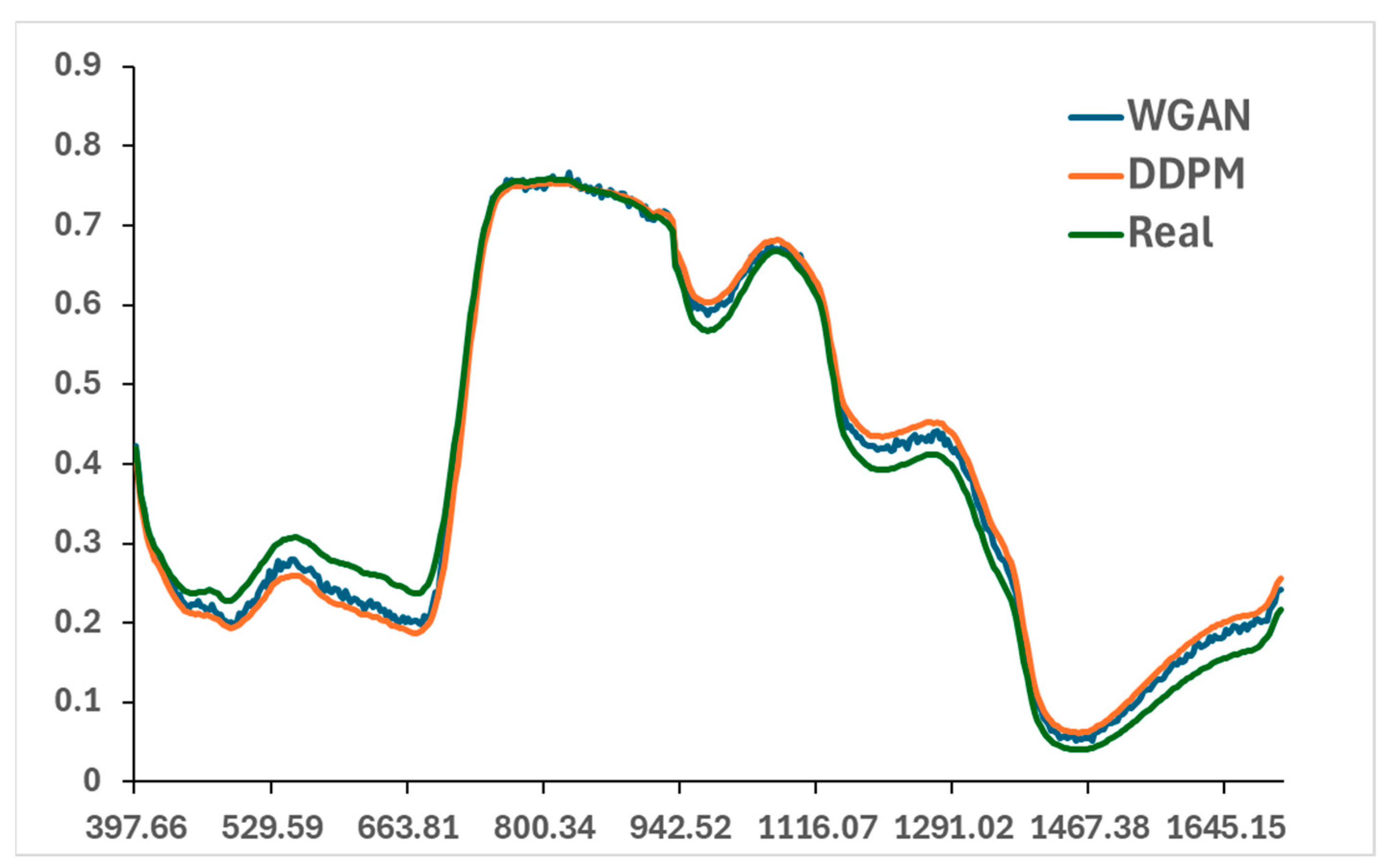 The WGAN-generated spectra were later compared with DDPM-generated data in terms of visual spectral consistency, distributional similarity, and downstream regression performance. This comparison provides a clear evaluation of the relative merits of diffusion-based versus adversarial-based generative frameworks for NIR data augmentation.
