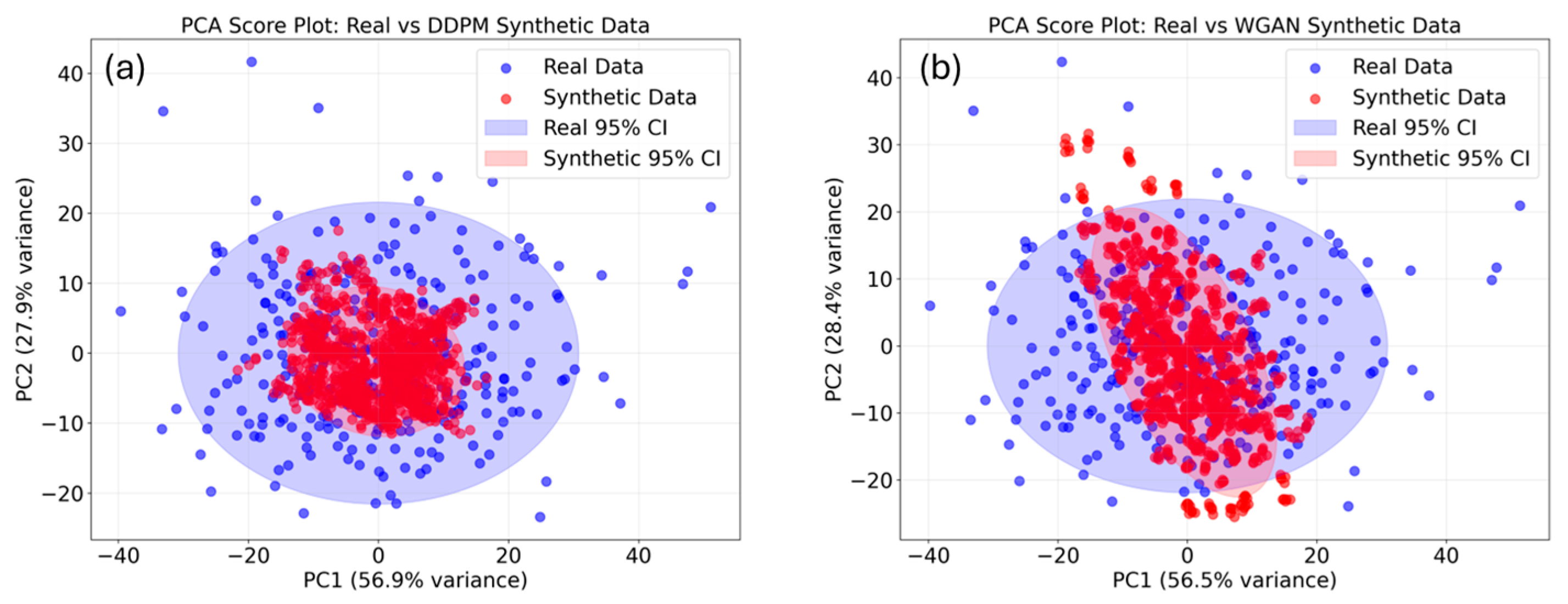 To comprehensively assess the quality and realism of the synthetic NIR spectra generated by the DDPM and WGAN models, multiple quantitative and visual evaluation metrics were employed. The Spectral Angle Mapper (SAM) score was used to measure the angular difference between synthetic and real spectra, providing an index of spectral similarity that is invariant to illumination intensity. Cosine similarity was additionally computed to quantify the alignment of spectral vectors, serving as a complementary measure to SAM. The Root Mean Square Error (RMSE) between synthetic and reference spectra was calculated to evaluate absolute spectral reconstruction accuracy. Furthermore, the Maximum Mean Discrepancy (MMD) with a radial basis function (RBF) kernel was applied to assess the overall distributional similarity between real and generated data in a high-dimensional feature space. To facilitate visual comparison of spectral distributions, Principal Component Analysis (PCA) was performed on the combined real and synthetic datasets, enabling inspection of how closely the generated samples aligned with the real data manifold in the reduced feature space. Together, these metrics provide a robust multi-perspective evaluation of spectral fidelity, structural consistency, and diversity of the synthetic datasets produced by both generative models.
