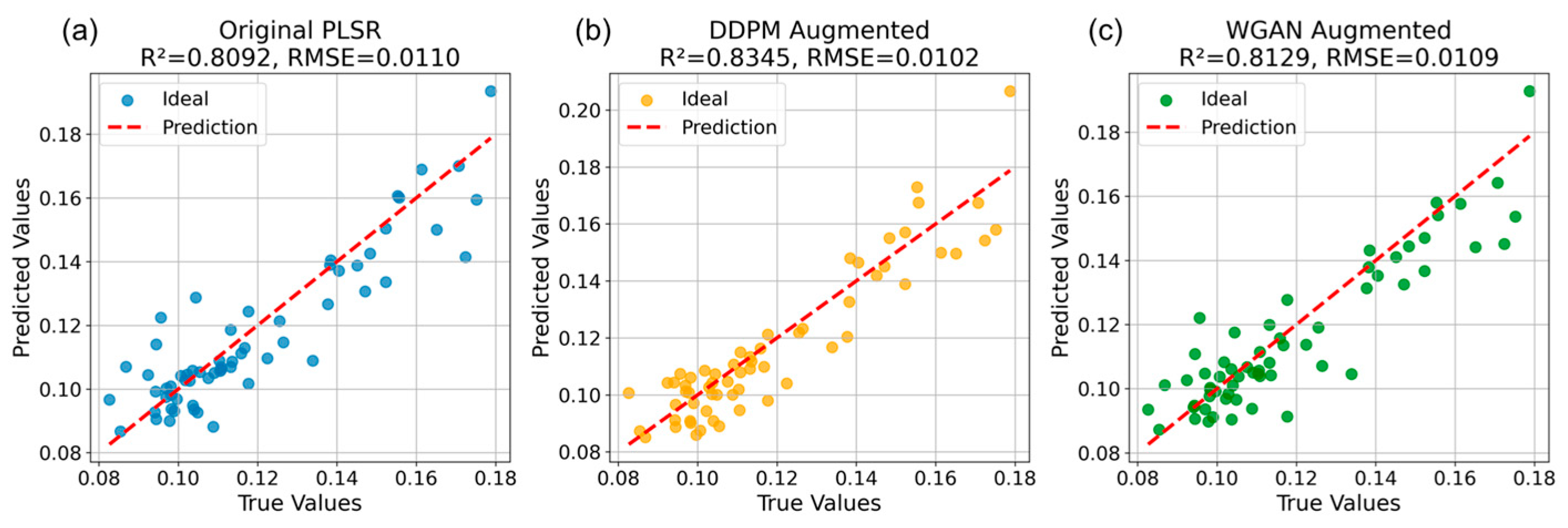 Table 3, all three regression models—PLSR, RF, and XGBoost—achieved improved predictive performance when trained on the DDPM-augmented dataset compared with the original training set and the WGAN-augmented dataset. This suggests that the synthetic samples contribute meaningful spectral variability, helping to regularize the model and prevent overfitting, especially under data-scarce conditions typical in agricultural datasets [