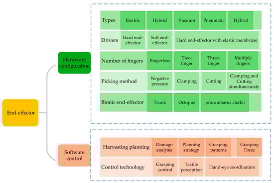 This section will elaborate on the key technologies of end-effectors from both hardware composition and software control perspectives. On the hardware side, the focus is on how the hardware components of end-effectors influence harvesting performance. On the software side, the latest research advancements in grasp planning and grasp control are highlighted. As shown in Figure 1, end-effectors can be broadly categorized into grippers, separation device, driver, and other components based on their hardware composition. Regarding software control, the subsection on harvesting planning techniques begins with an analysis of the biomechanical properties and damage mechanisms of fruits and vegetables. It further delves into the impact of end-effector picking obstacle-avoidance strategies, grasp position planning, and grasp force output on harvesting operations. In the subsection on control techniques, the study explores research on control methods, contact sensing technologies, and hand–eye coordination in end-effectors, aiming to meet operational control precision and enhance harvesting efficiency.